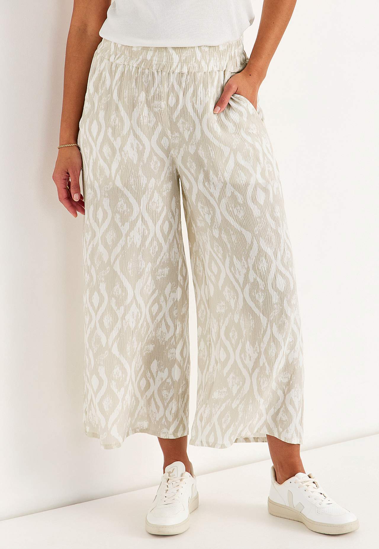 Kreppkangast culotte püksid. Õhku läbilaskev materjal. Lai, elastne värvel. Külgedel viltused taskud. Sääre sisepikkus kõikidel suurustel umbes 60 cm. Sobita tootega 702443.