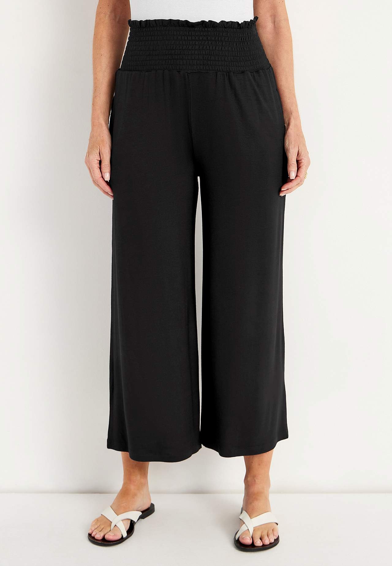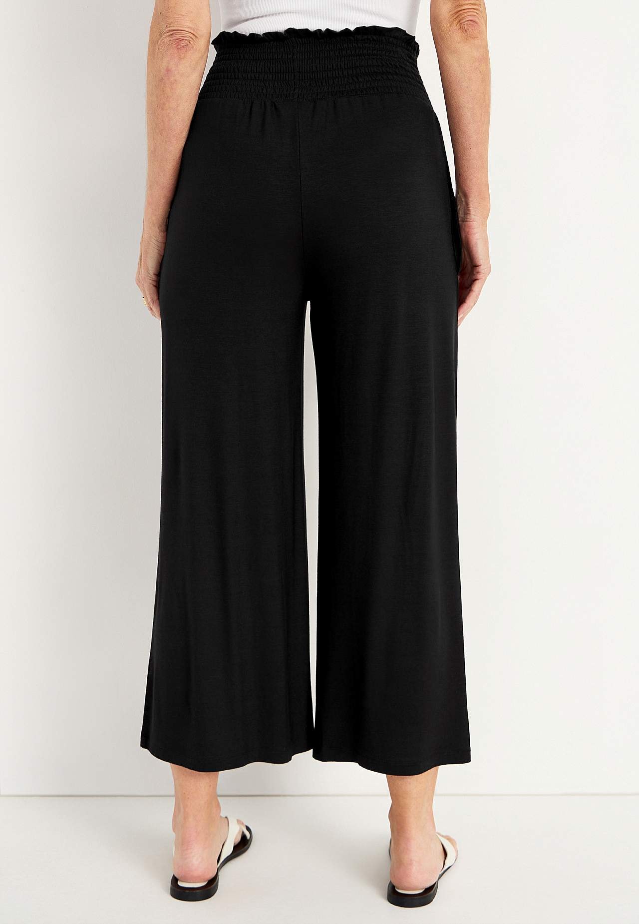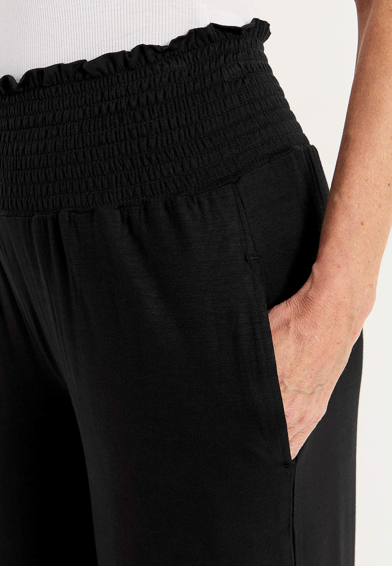 Kauni langevusega laiade säärtega püksid, meeldivast pehmest viskoosist. Veniv, jaheda tundega pehme kangas. Sirge, avar tegumood. Laia värvliga elastne vöökoht. Küljeõmblustes taskud. Sääre sisepikkus umbes 60 cm kõikidel suurustel. Hargmiku kõrgus vastavalt suurusele umbes 31-41 cm.