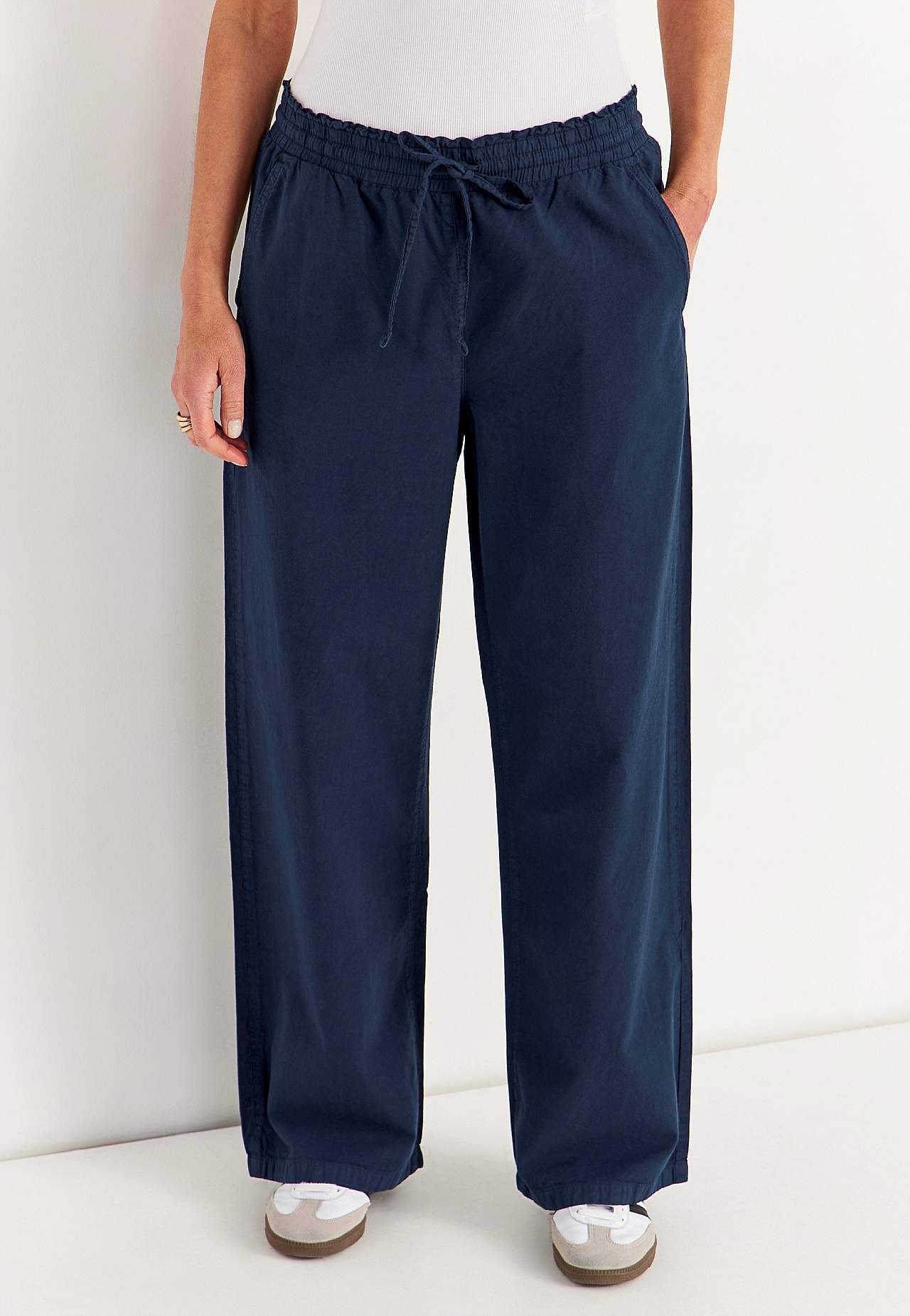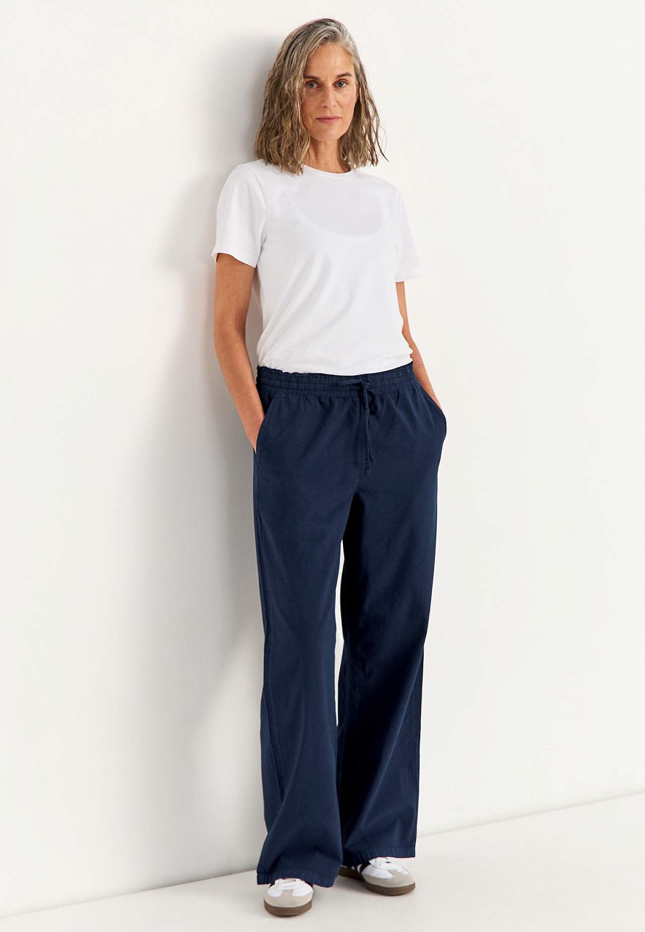Pikkade ja laiade säärtega vabaaja püksid. Naturaalse välimusega läbipestud pehme puuvillane materjal. Lai ja avar mudel. Pingutusnööriga elastne vöökoht. Ees viltused taskud. Taga ehistaskud. Laiad ja sirged sääred. Sääre sisepikkus kõikidel suurustel u 75 cm. Hargmiku kõrgus vastavalt suurusele u 27–37 cm.