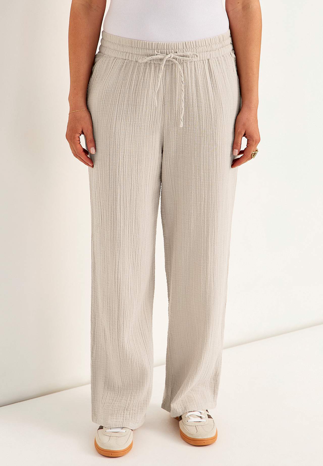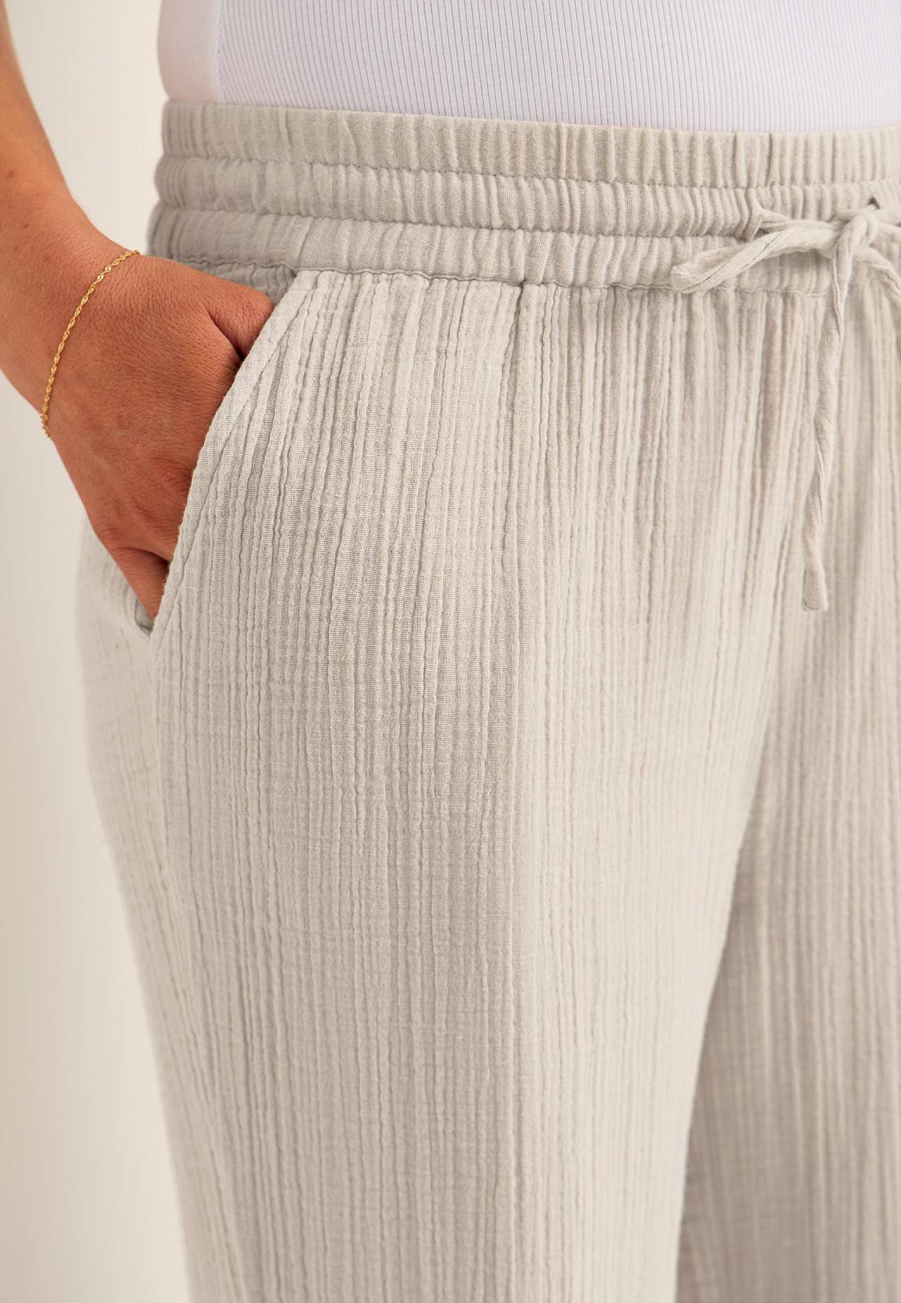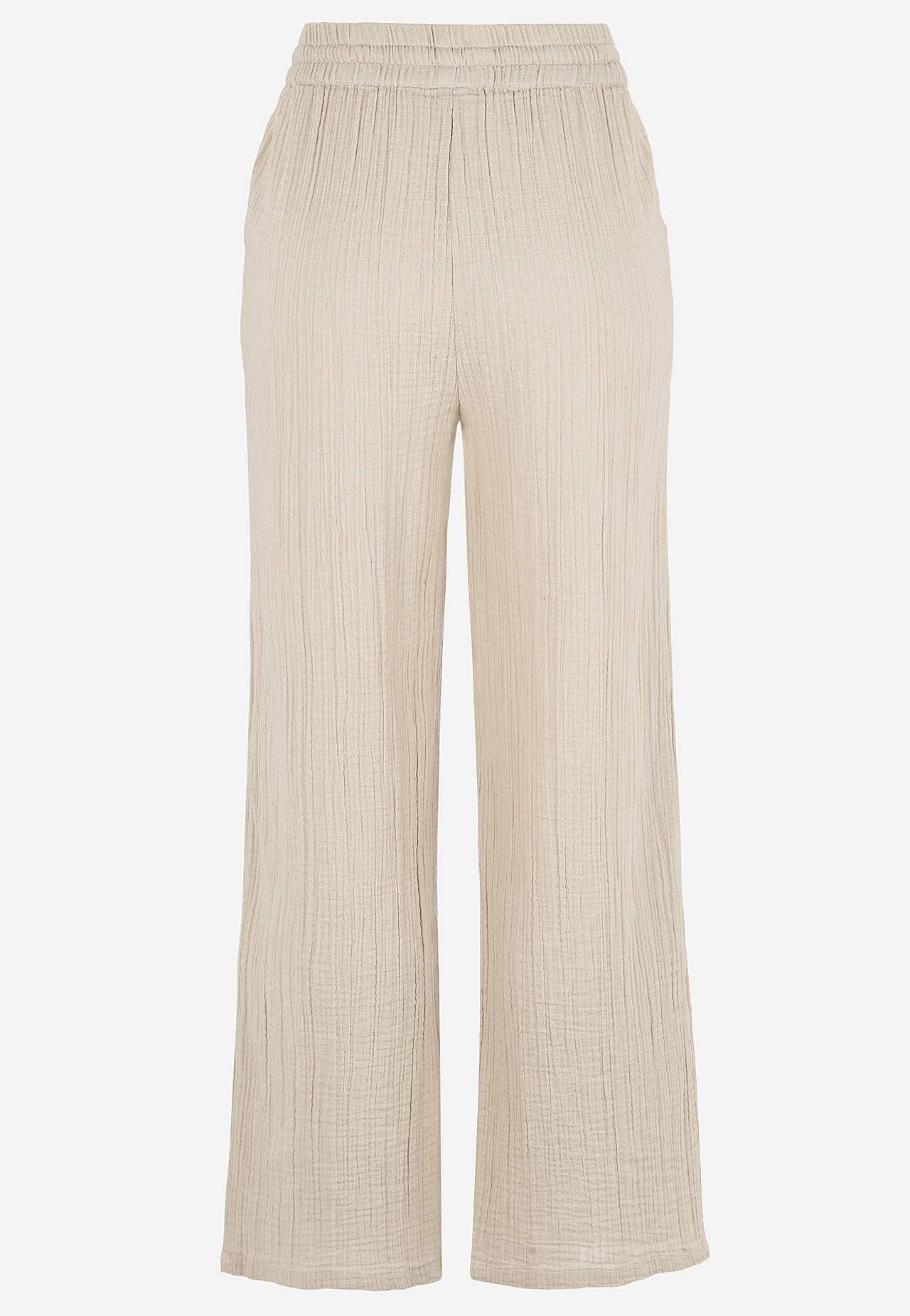 Mõnusast puuvillasest, naturaalse tekstuuriga materjalist püksid. Pehme materjal, jaheda ja õhulise tundega. Lai ja pehme elastne vöökoht pingutusnööriga. Ees viltused taskud. Pikad ja laiad sääred. Sääre sisepikkus kõikidel suurustel u. 73 cm.