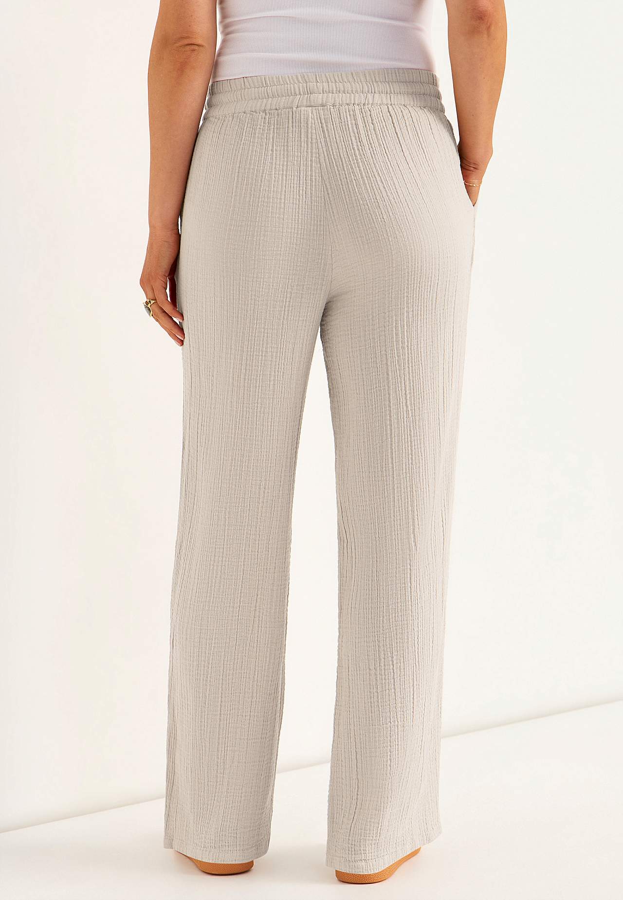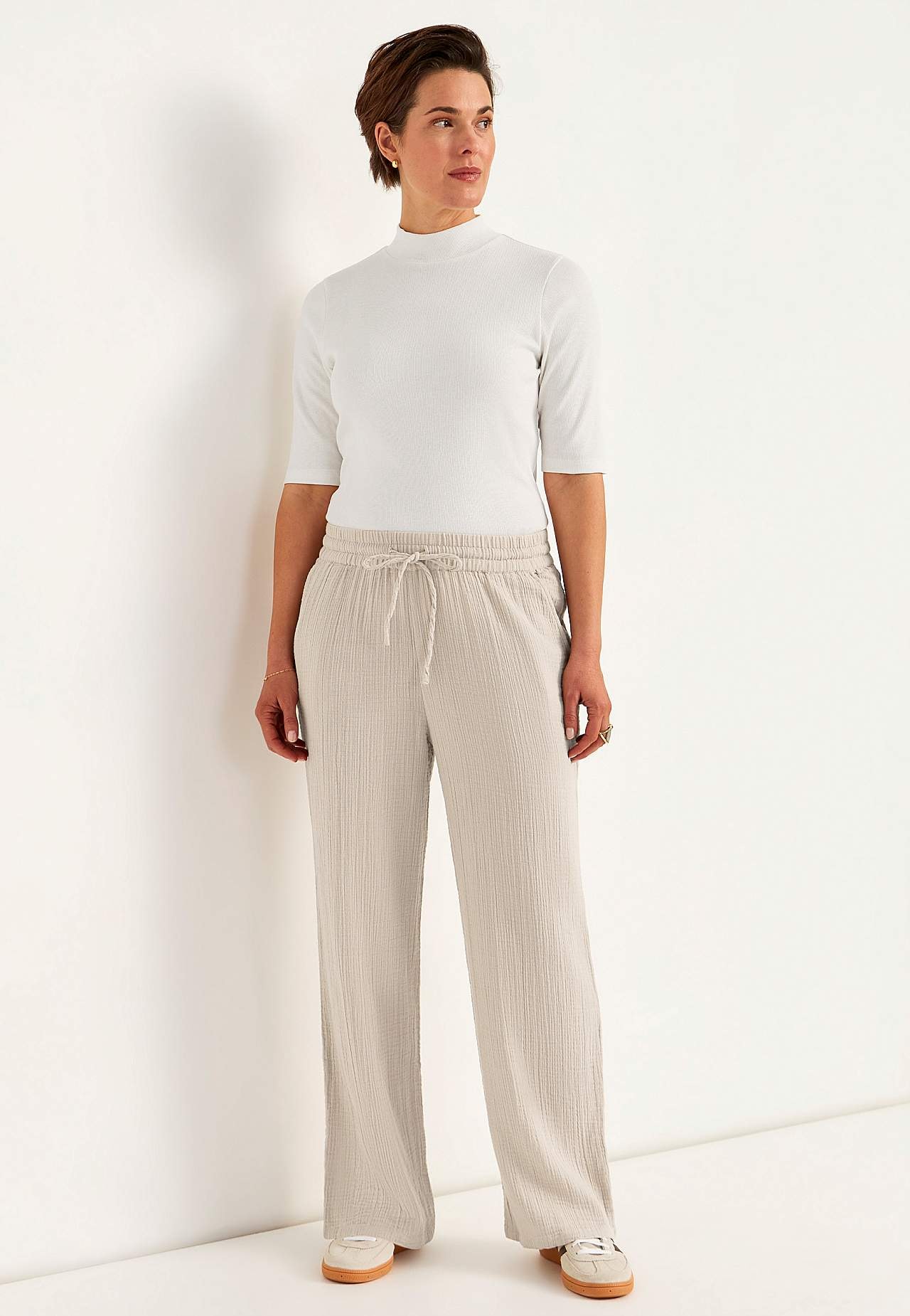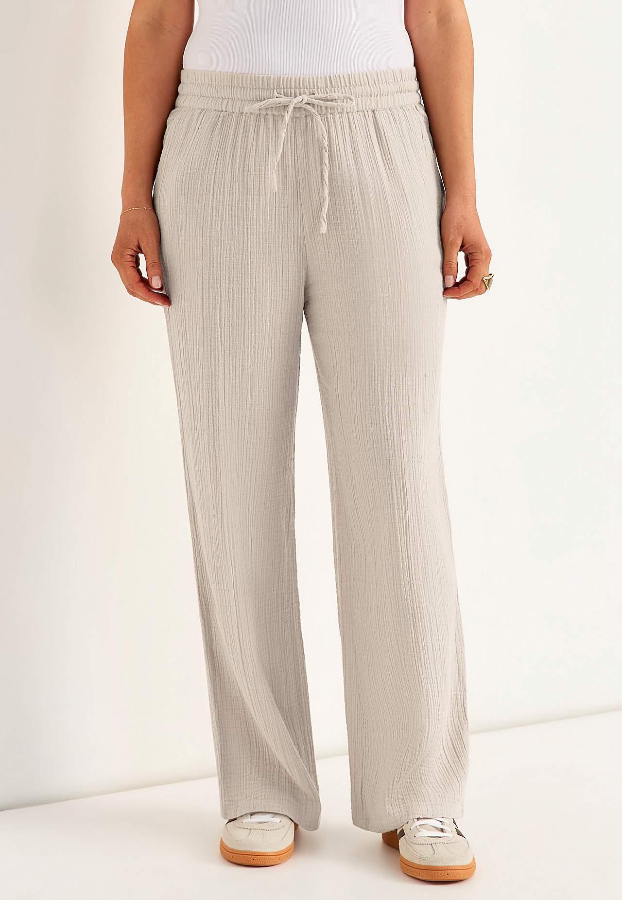 Mõnusast puuvillasest, naturaalse tekstuuriga materjalist püksid. Pehme materjal, jaheda ja õhulise tundega. Lai ja pehme elastne vöökoht pingutusnööriga. Ees viltused taskud. Pikad ja laiad sääred. Sääre sisepikkus kõikidel suurustel u. 73 cm.
