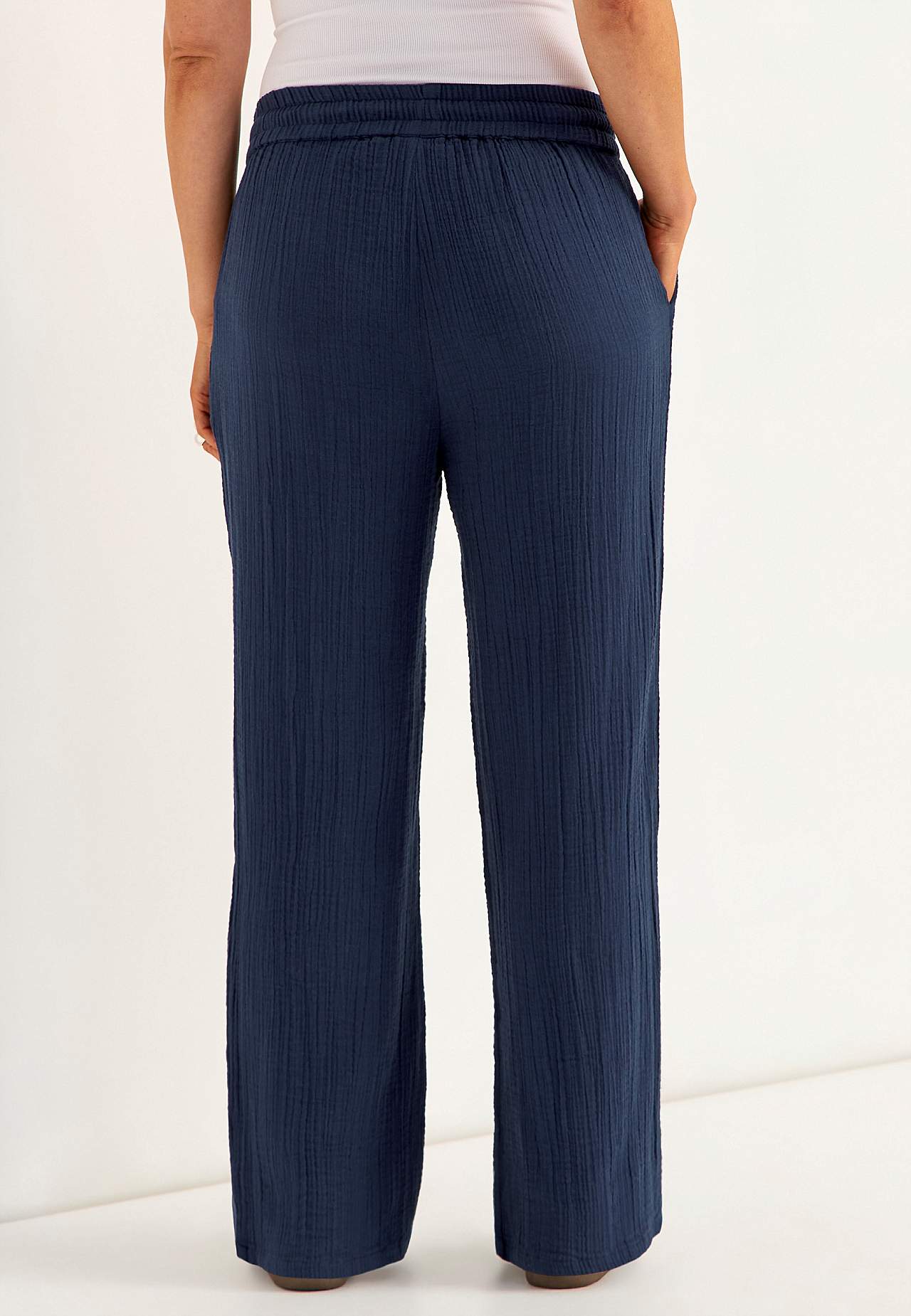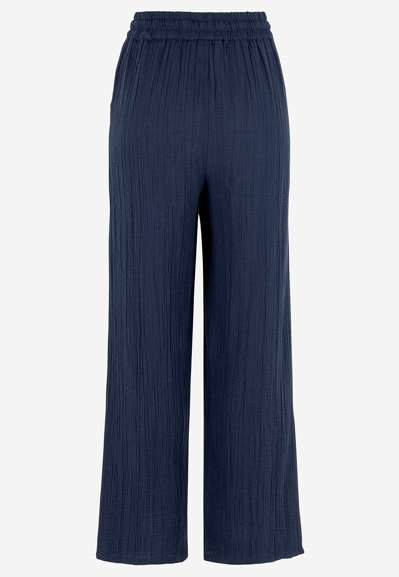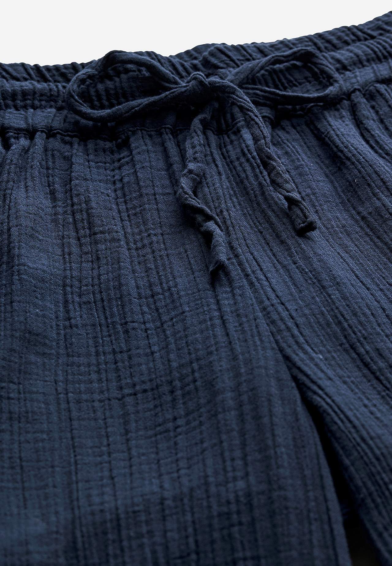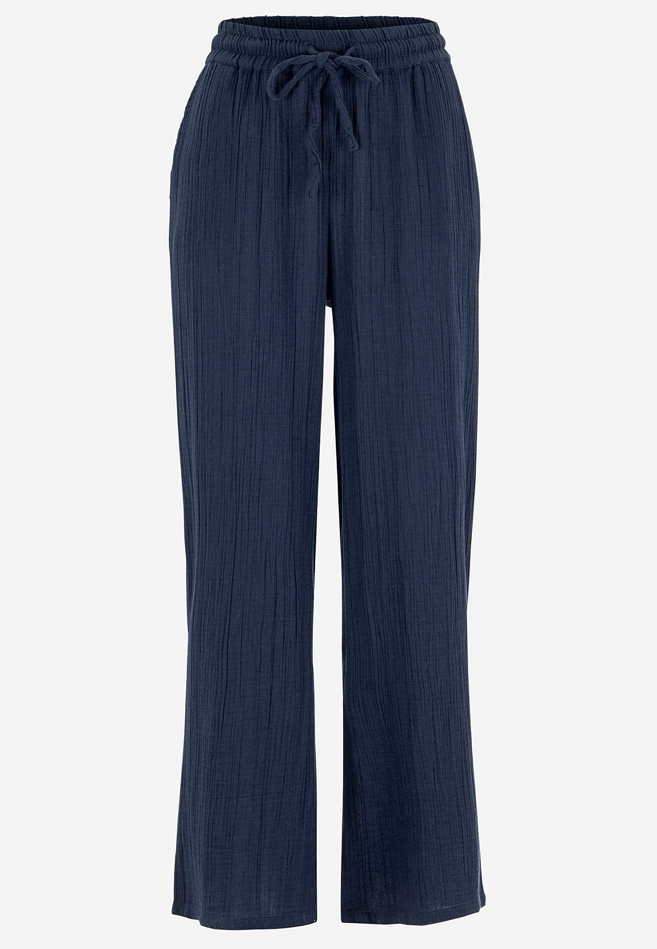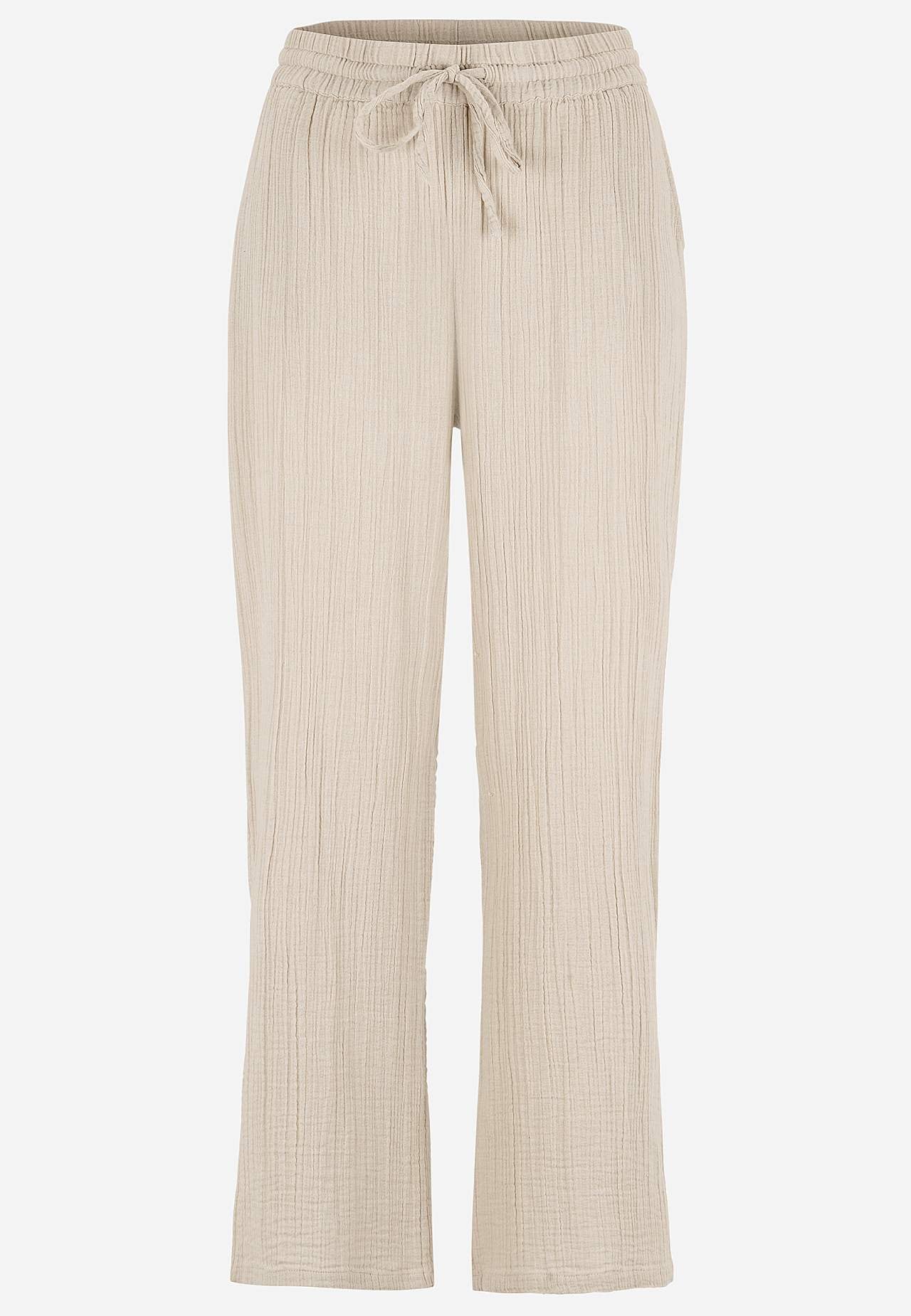 Mõnusast puuvillasest, naturaalse tekstuuriga materjalist püksid. Pehme materjal, jaheda ja õhulise tundega. Lai ja pehme elastne vöökoht pingutusnööriga. Ees viltused taskud. Pikad ja laiad sääred. Sääre sisepikkus kõikidel suurustel u. 73 cm.