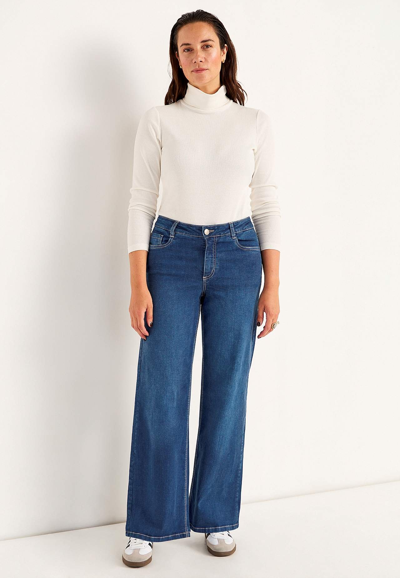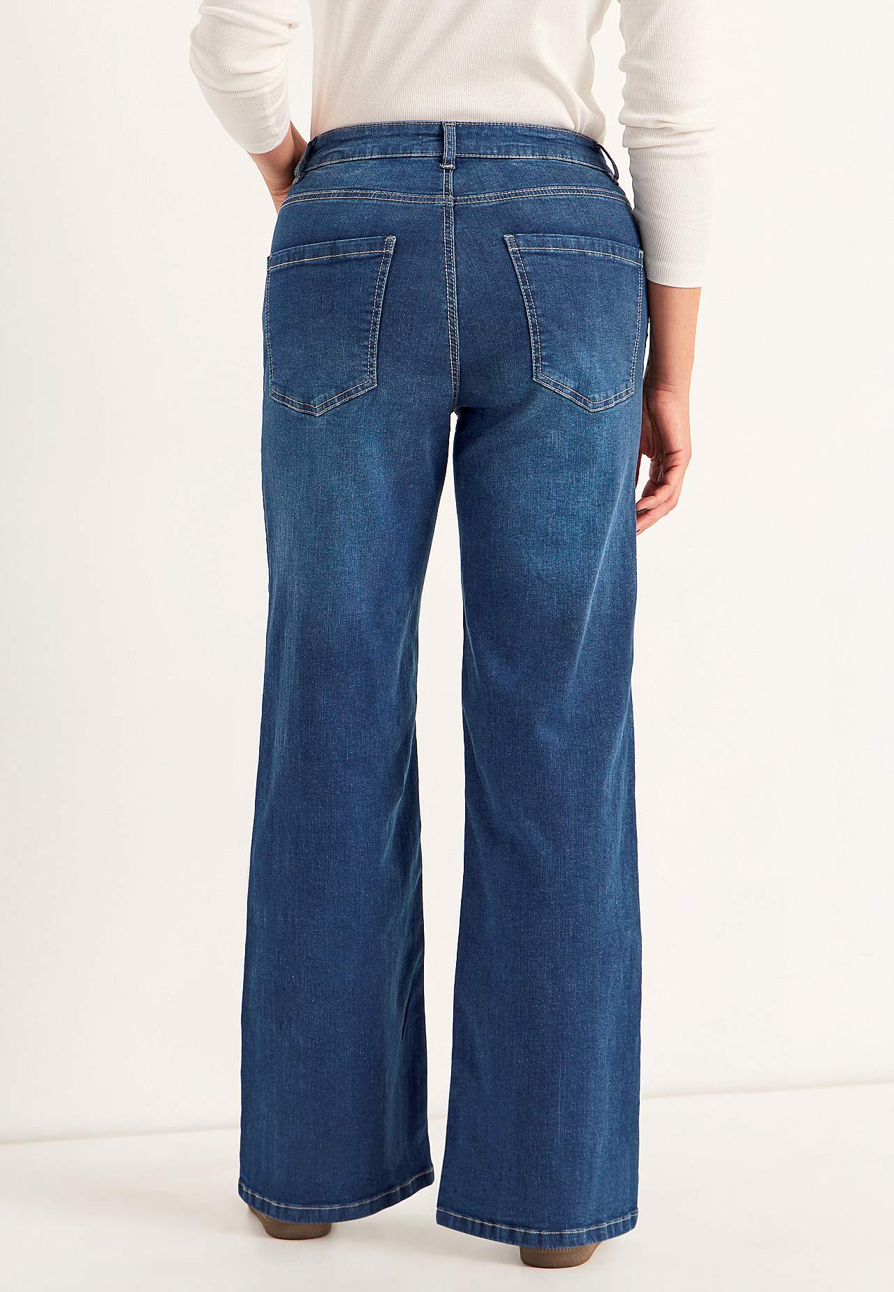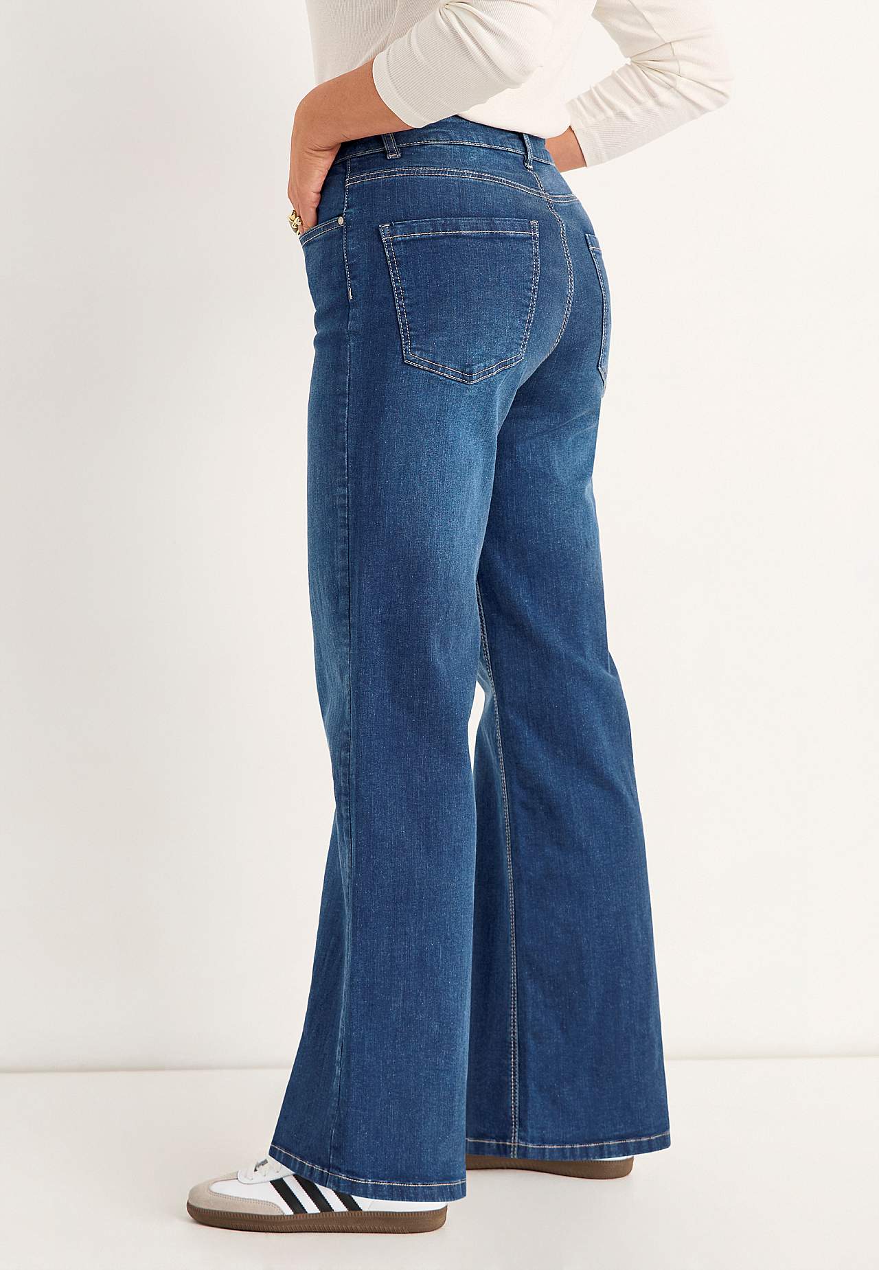 Viie taskuga mudel. Kõrge vöökoht. Sirge tegumood. Laia lõikega sääred. Nööbiga tõmblukukinnis. Vööaasadega värvel. Sääre sisepikkus kõikidel suurustel umbes 80 cm. Hargmiku kõrgus vastavalt suurusele umbes 24-35 cm. Saadaval siseräärepikkusega 85 cm. Vaata toodet: 700142