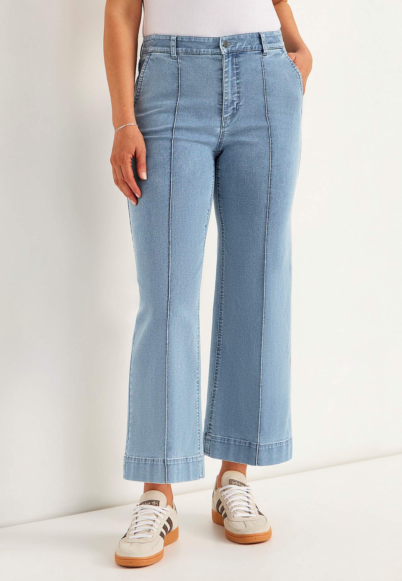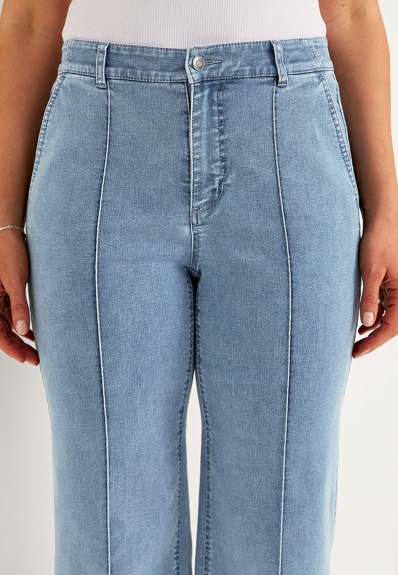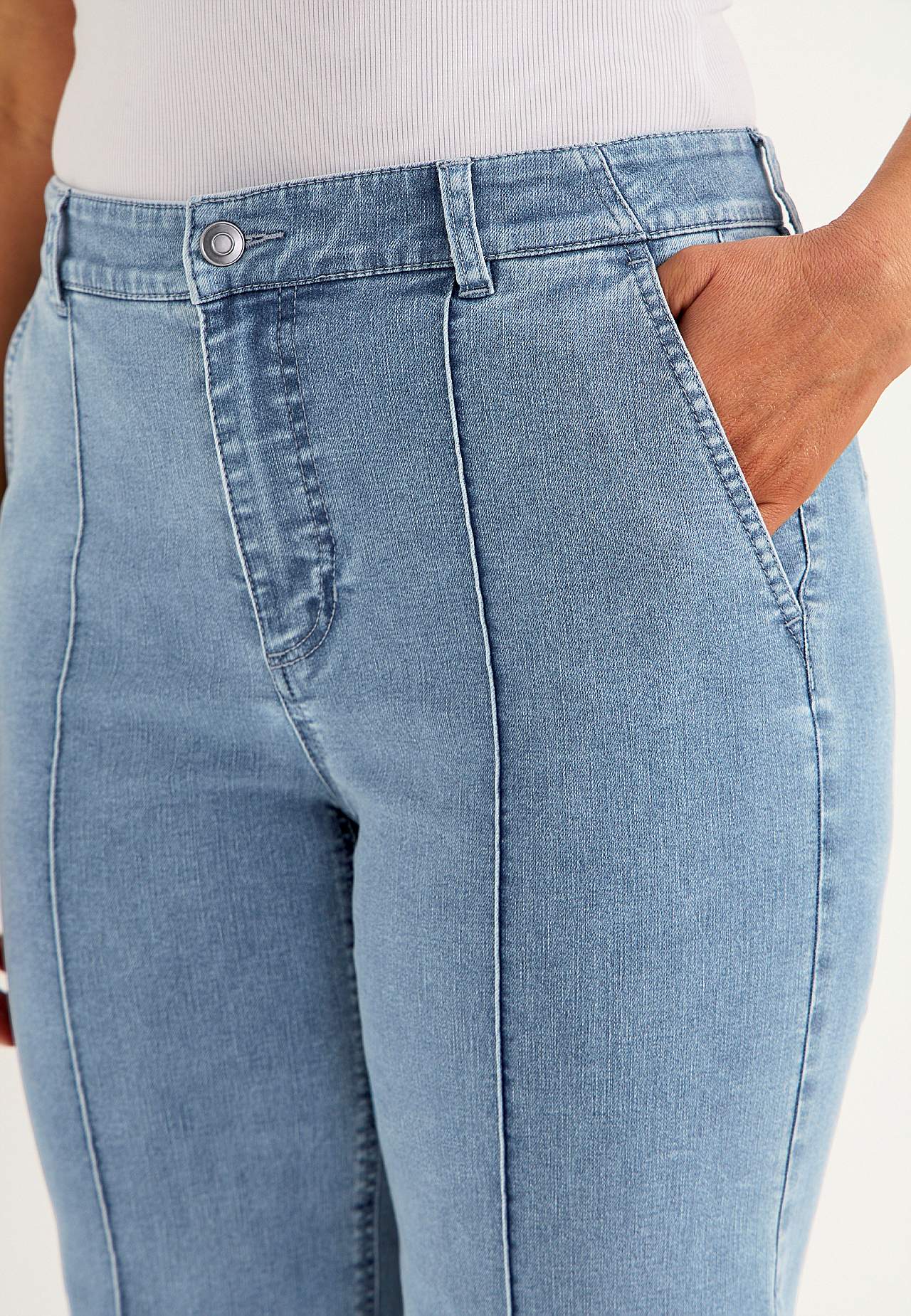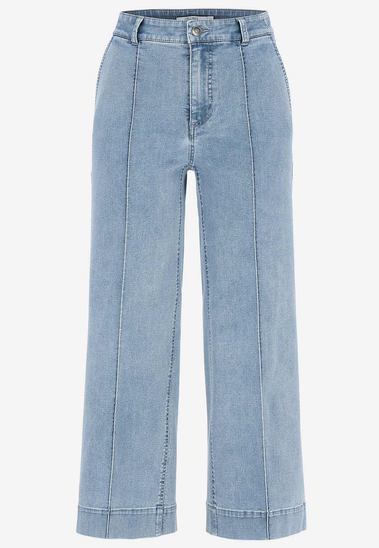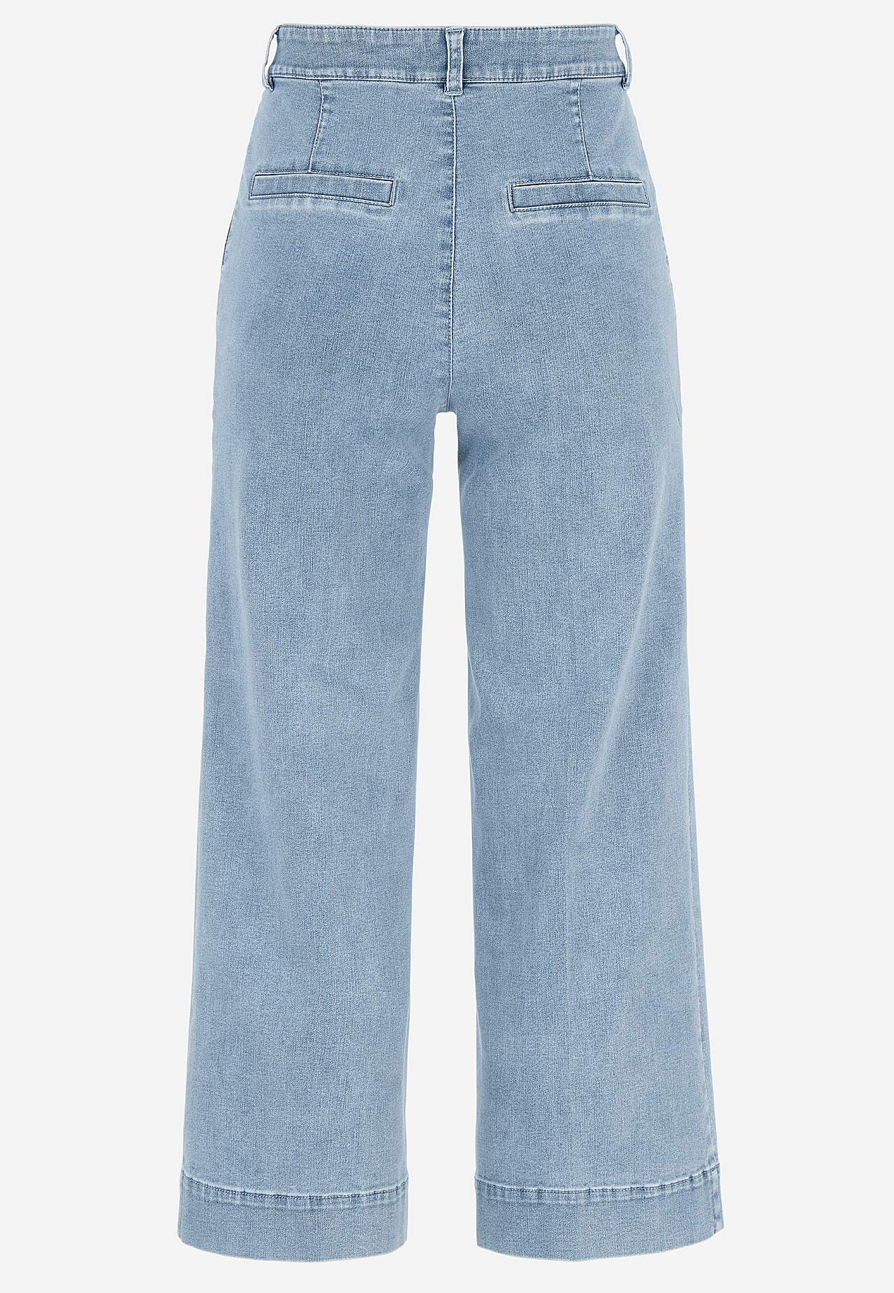Pahkluupikkuses elastsest ja pehmest teksakangast püksid. Sirge lõikega ja laiade sääreosadega. Avara lõikega. Veidi kitsama ülaosaga. Tavakõrguses vöökoht. Vööaasadega värvel. Ees nööbiga ja tõmblukuga kinnis. Ees viltused küljetaskud. Ees sisseõmmeldud viigid. Taga ehistaskud. Sääre sisepikkus kõikidel suurustel u 65 cm. ... Loe rohkem