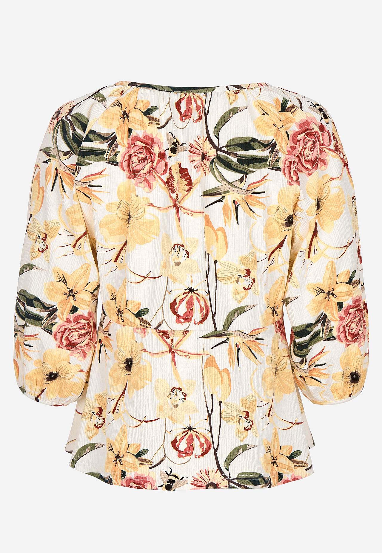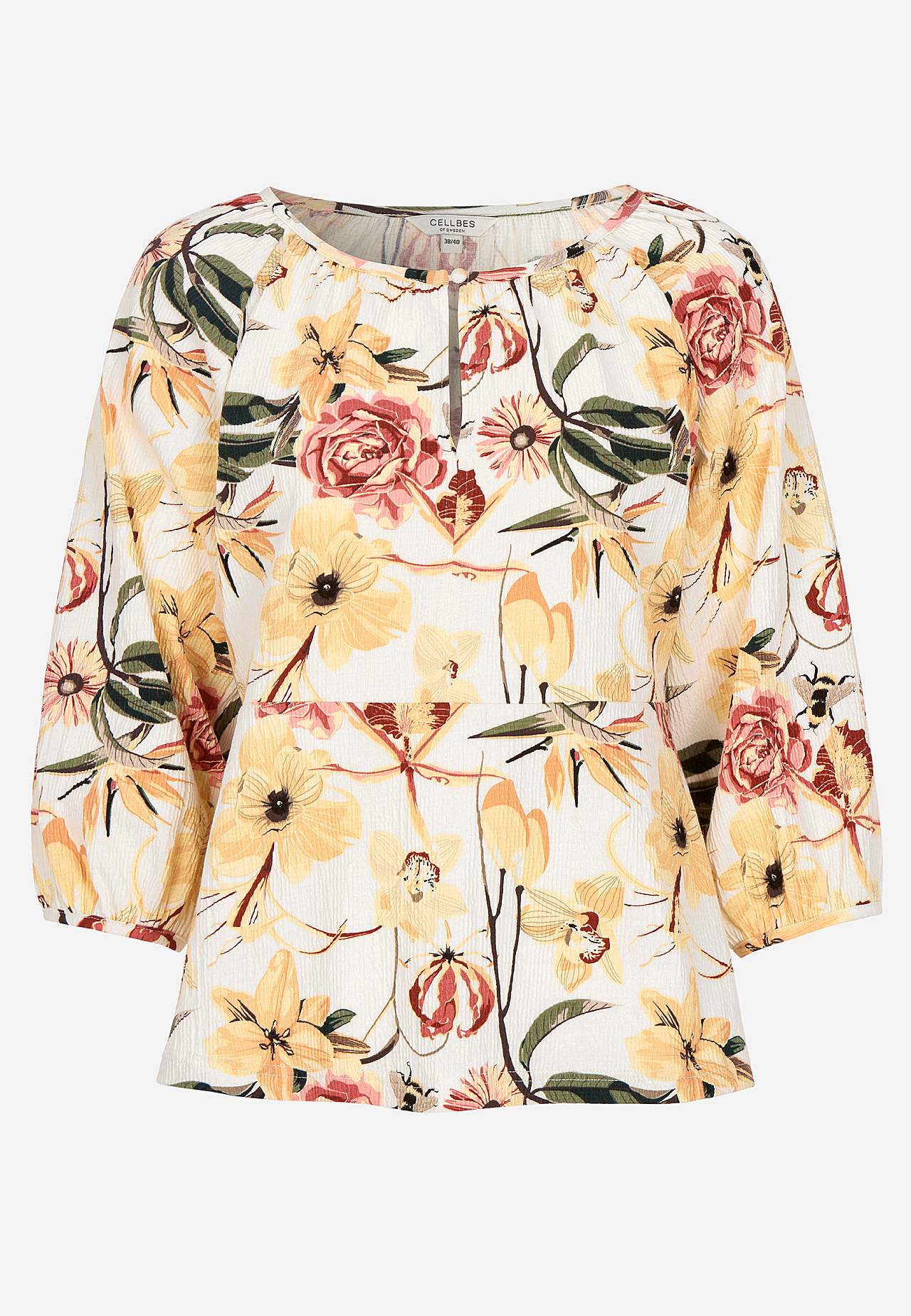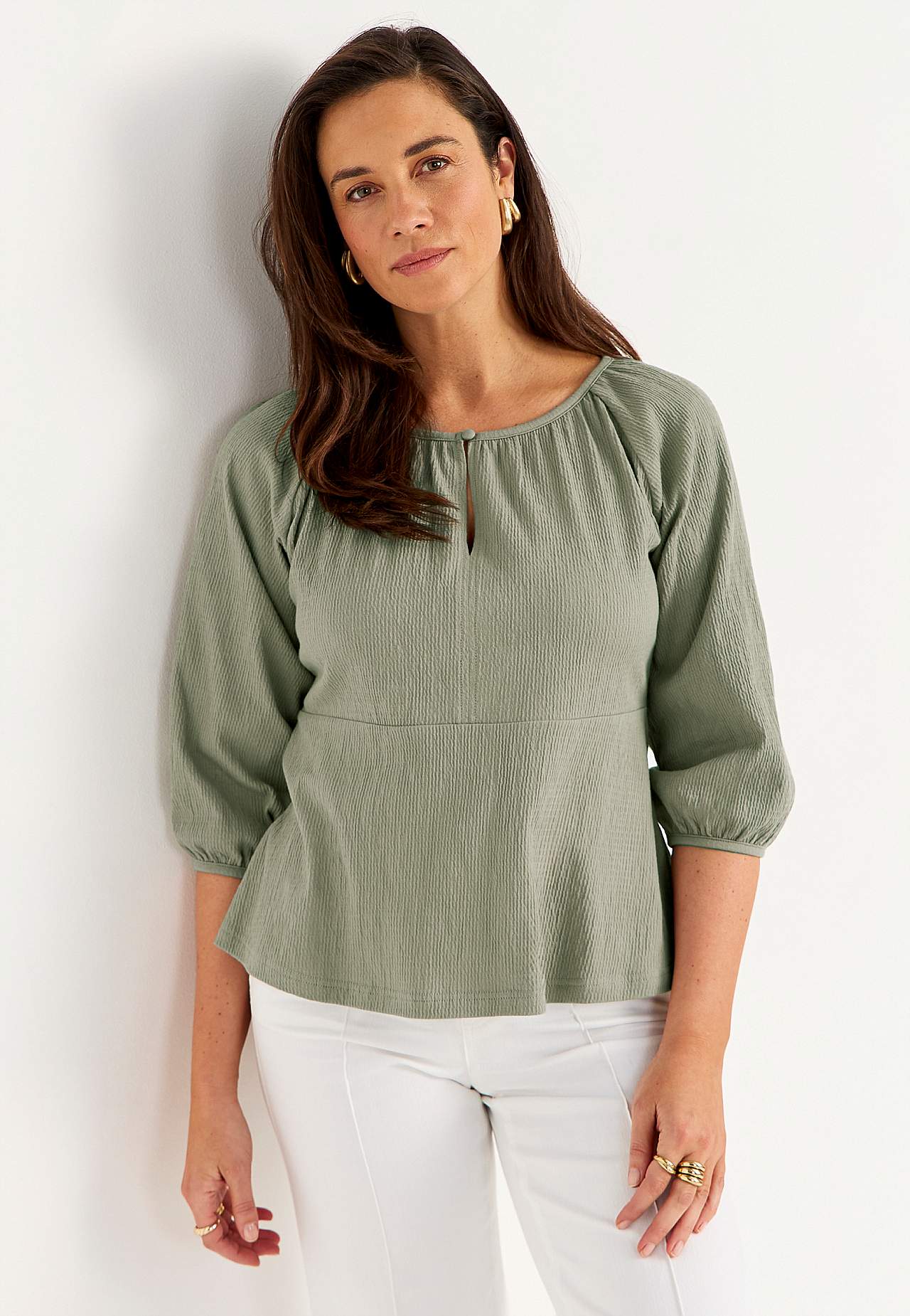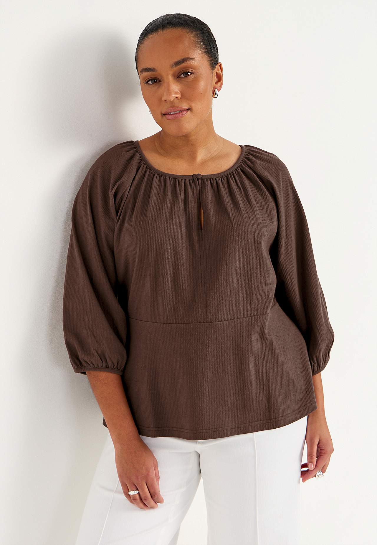 Elastne, pehme, kergelt kortsulisest materjalist topp. Figuuri järgiva ülaosaga ja kergelt laieneva alläärega. Ümar kaelus väikese nööbi ja lõhikuga. 3/4 pikkuses laiade raglaanvarrukate otstes elastsed kätised. Kaarjas alläär. Selja pikkus vastavalt suurusele u 60–72 cm.