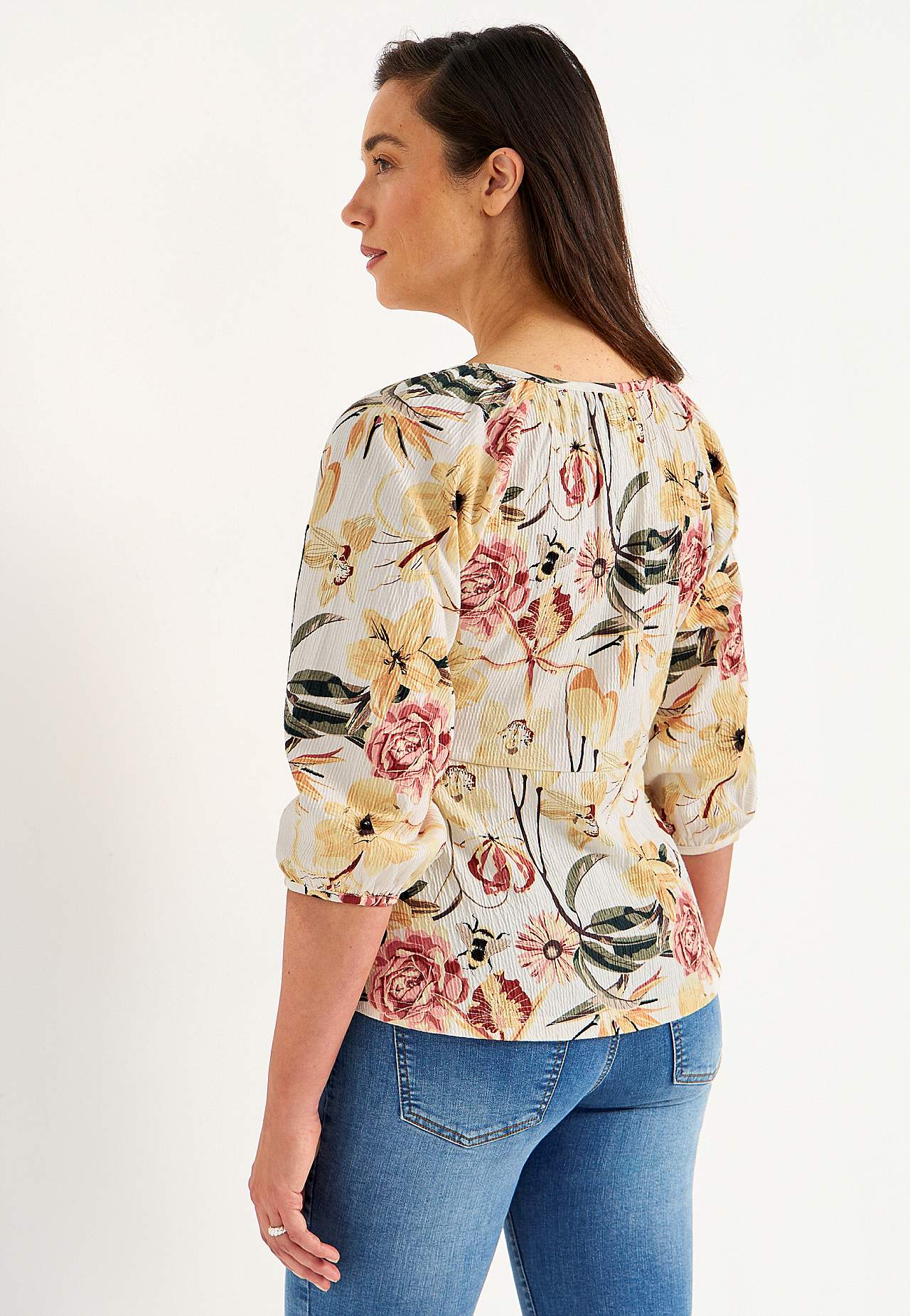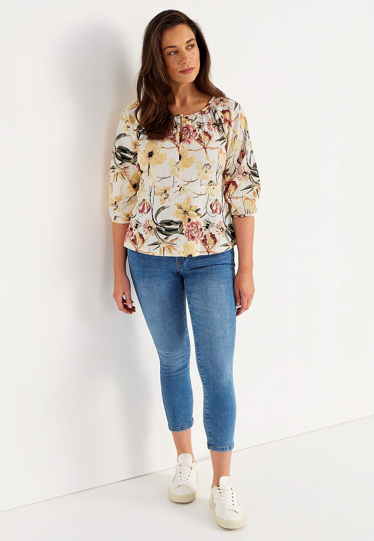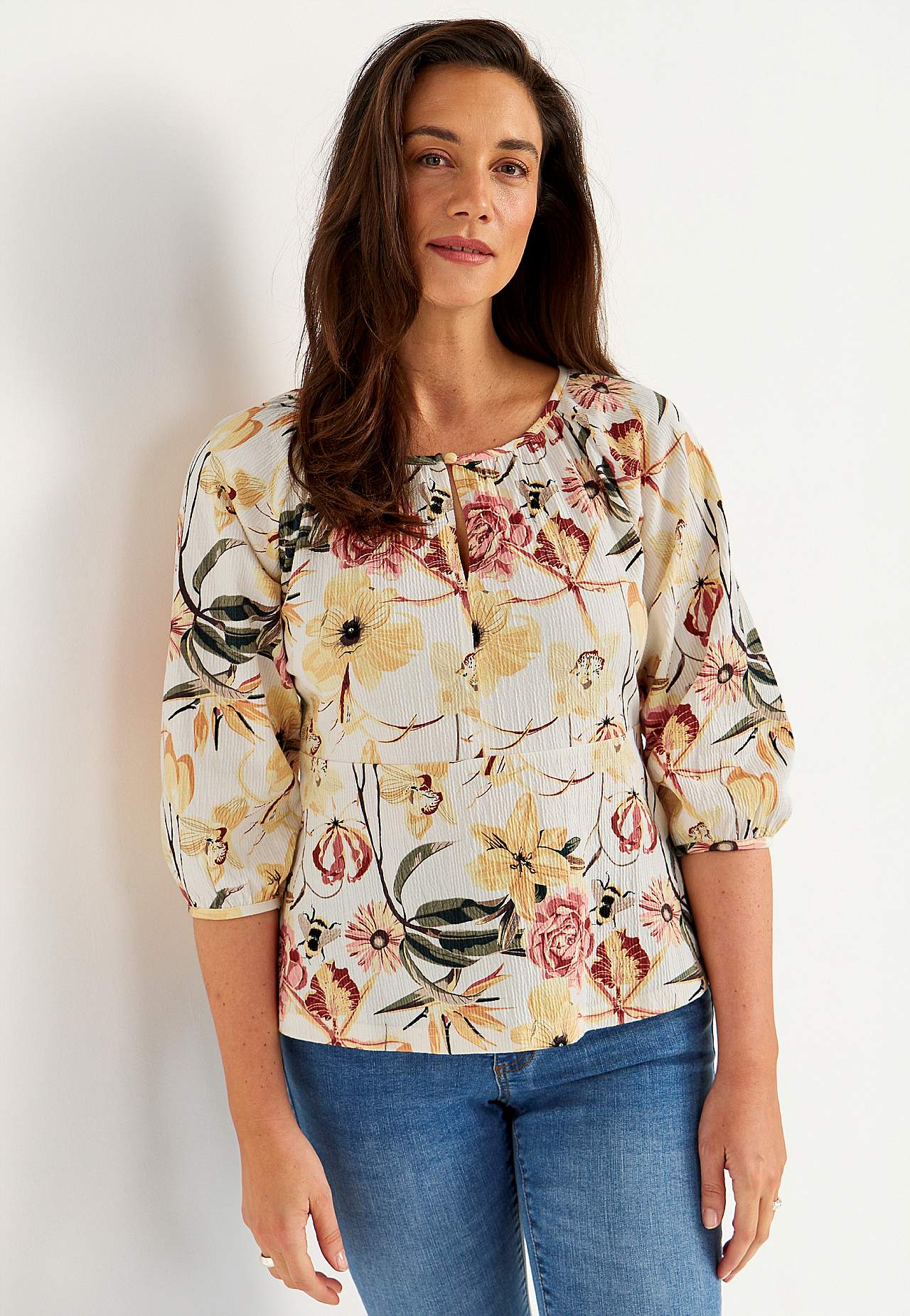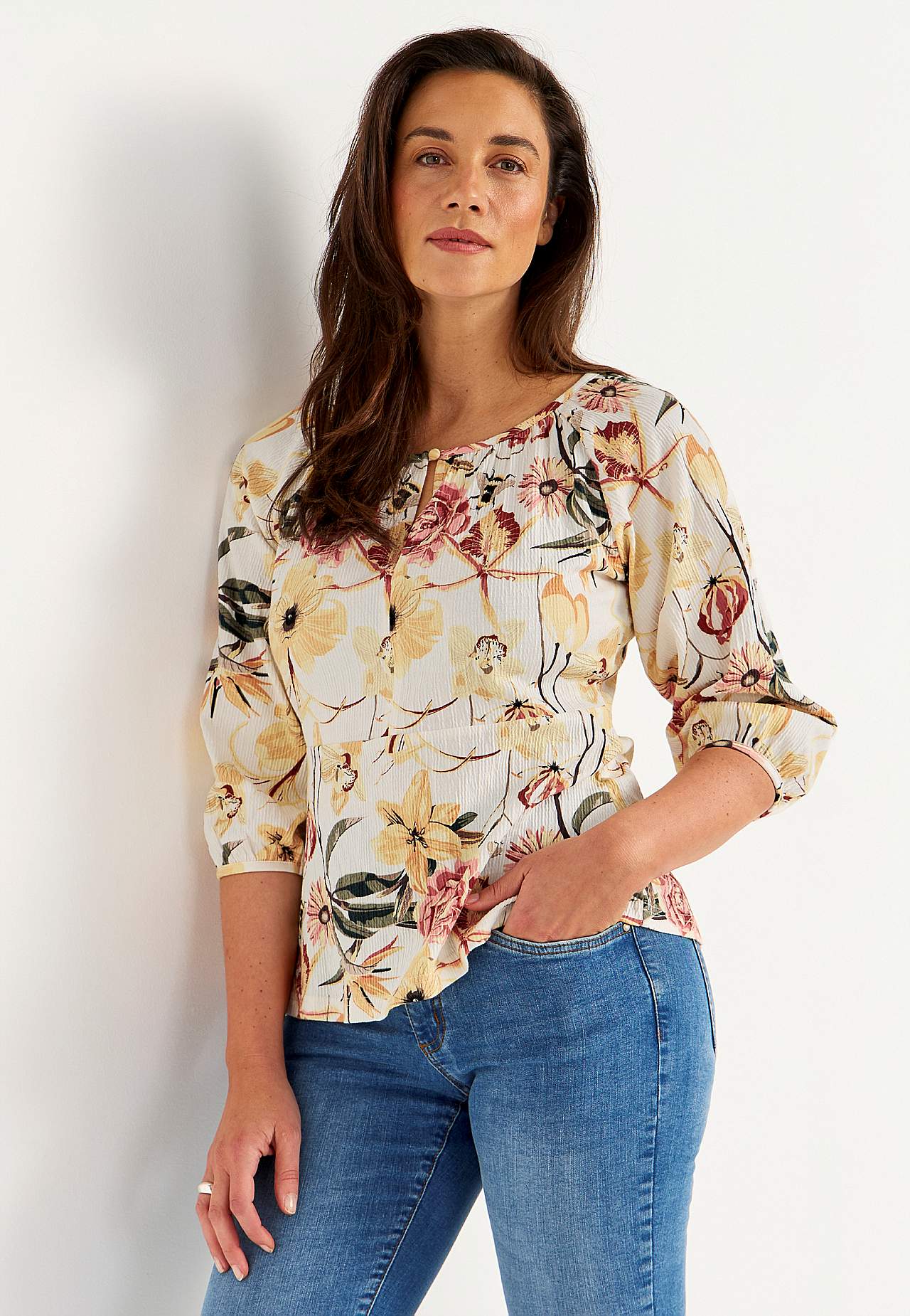 Elastne, pehme, kergelt kortsulisest materjalist topp. Figuuri järgiva ülaosaga ja kergelt laieneva alläärega. Ümar kaelus väikese nööbi ja lõhikuga. 3/4 pikkuses laiade raglaanvarrukate otstes elastsed kätised. Kaarjas alläär. Selja pikkus vastavalt suurusele u 60–72 cm.