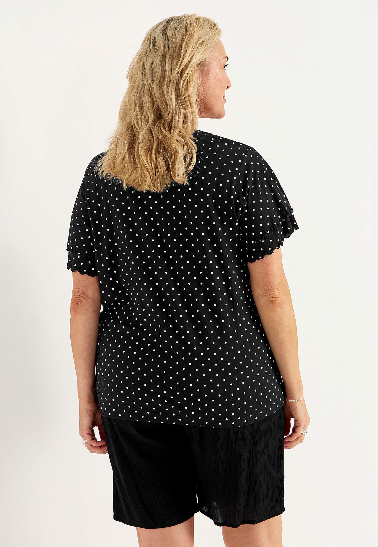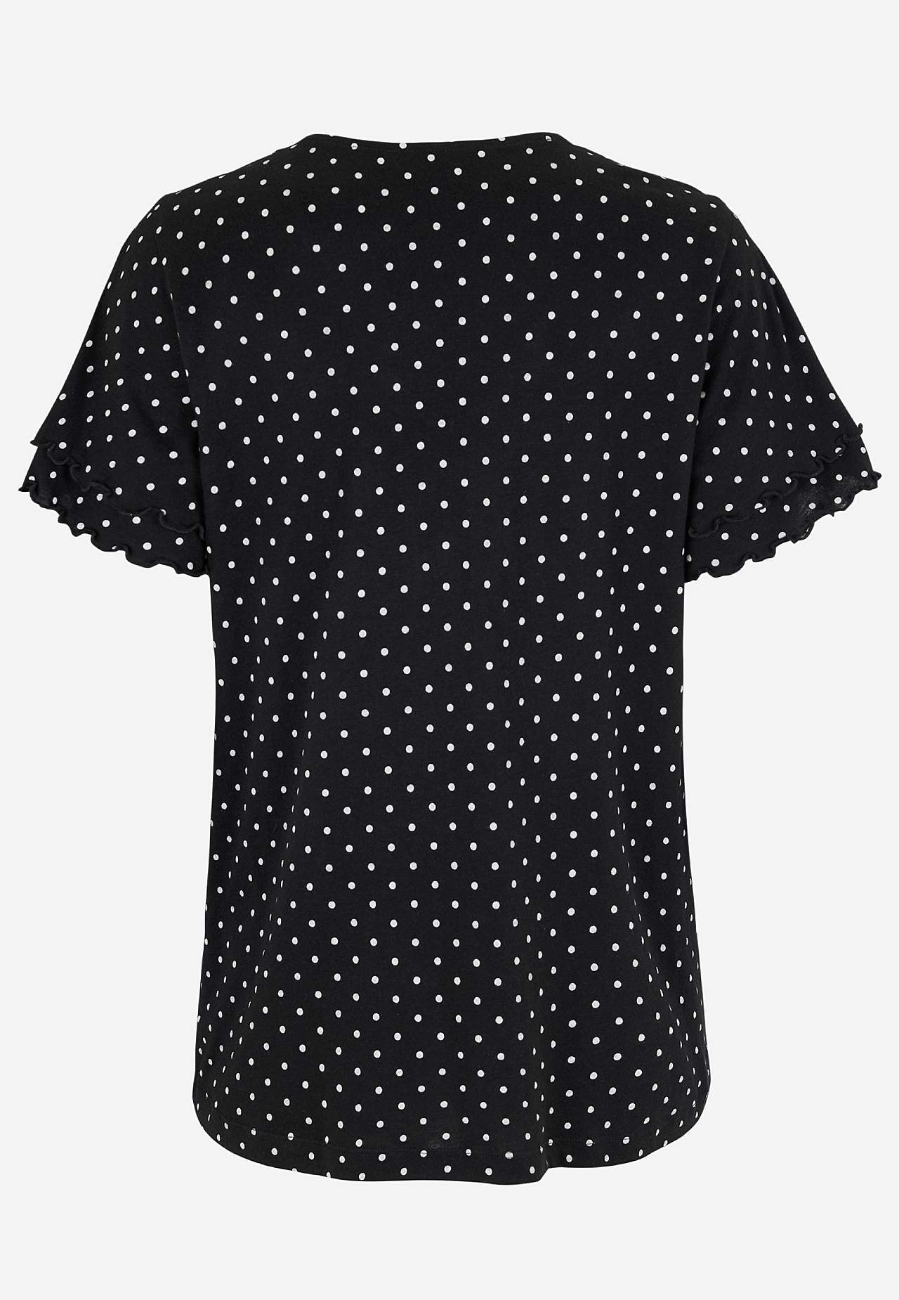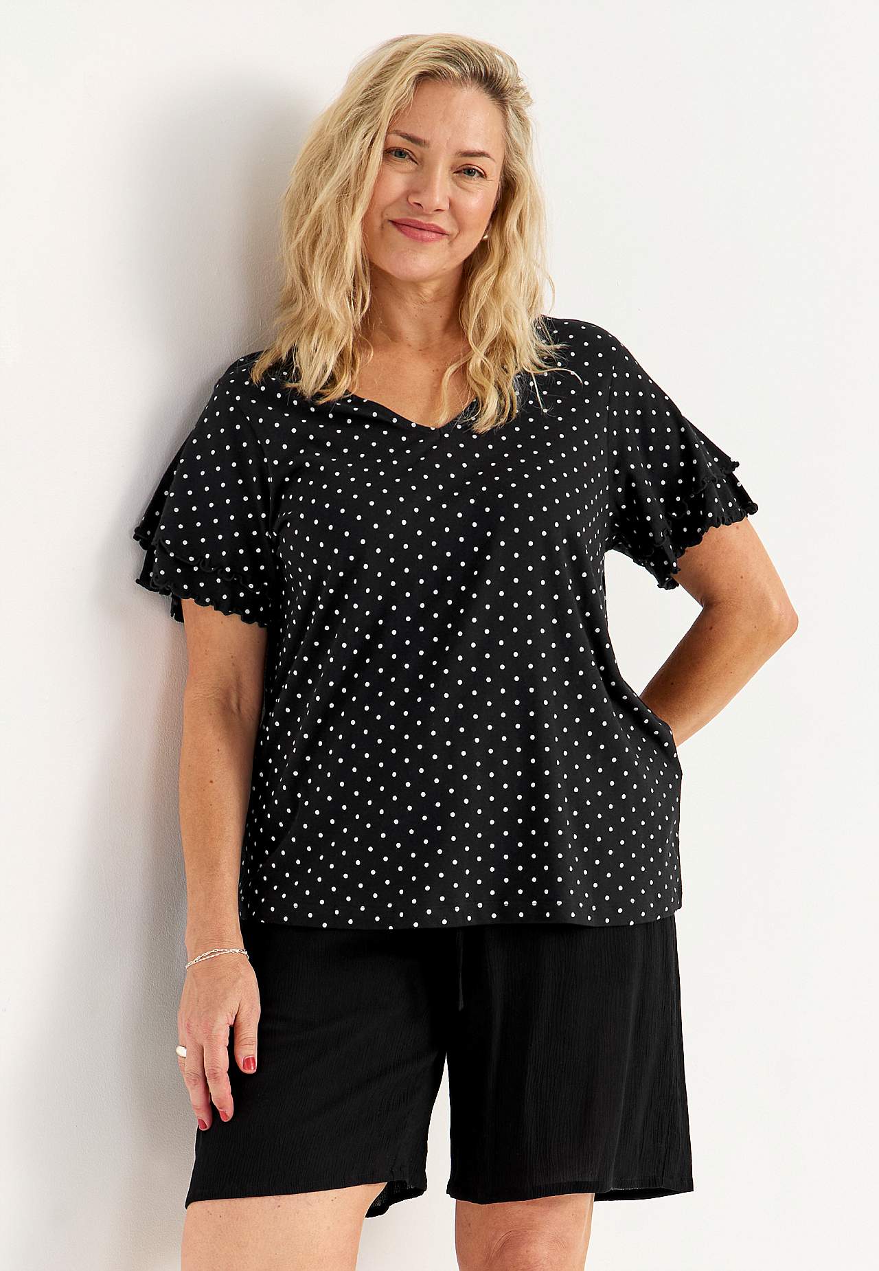 Liblikvarrukatega naiselik topp. Pehmest puuvilla- ja viskoosisegusest trikotaažist. Kergelt A-lõikeline. V-kaelus. Lühikesed liblikvarrukad kahekordse volangi ja overlokk õmblusega. Kergelt kaarjas alläär. Selja pikkus vastavalt suurusele u 65-73 cm.