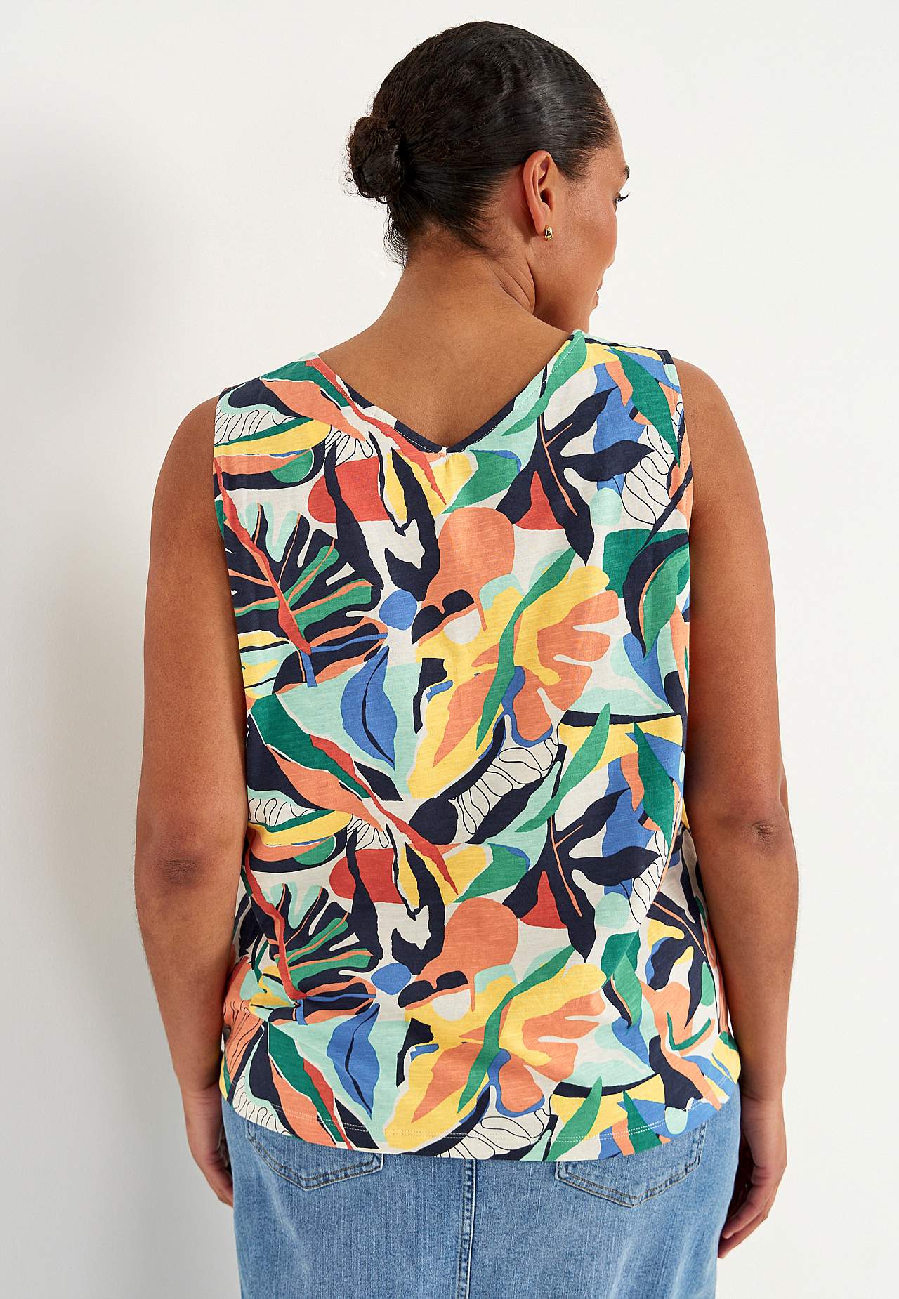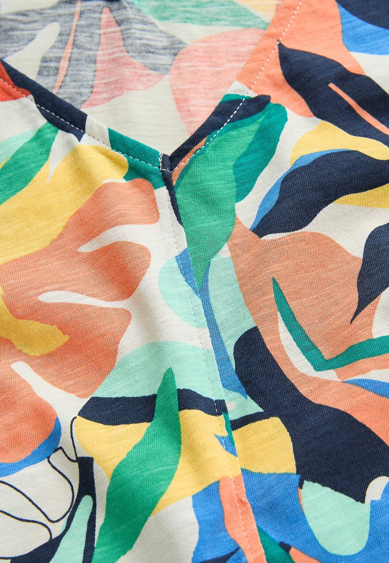 Õhuline materjal sissekootud slub-niitidega. Kergelt A-lõikeline mudel. V-kaelus nii ees kui ka taga. Dekoratiivõmblus ees keskel. Seljapikkus vastavalt suurusele u 60–72 cm.