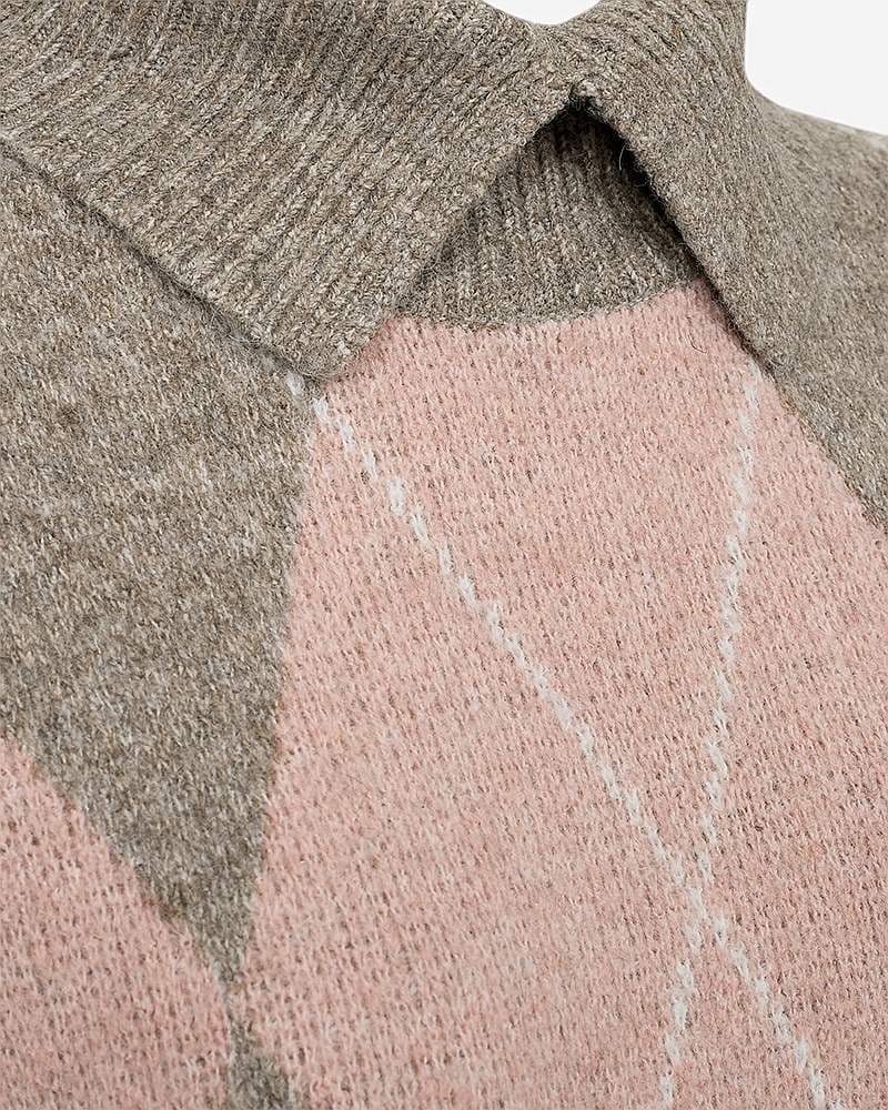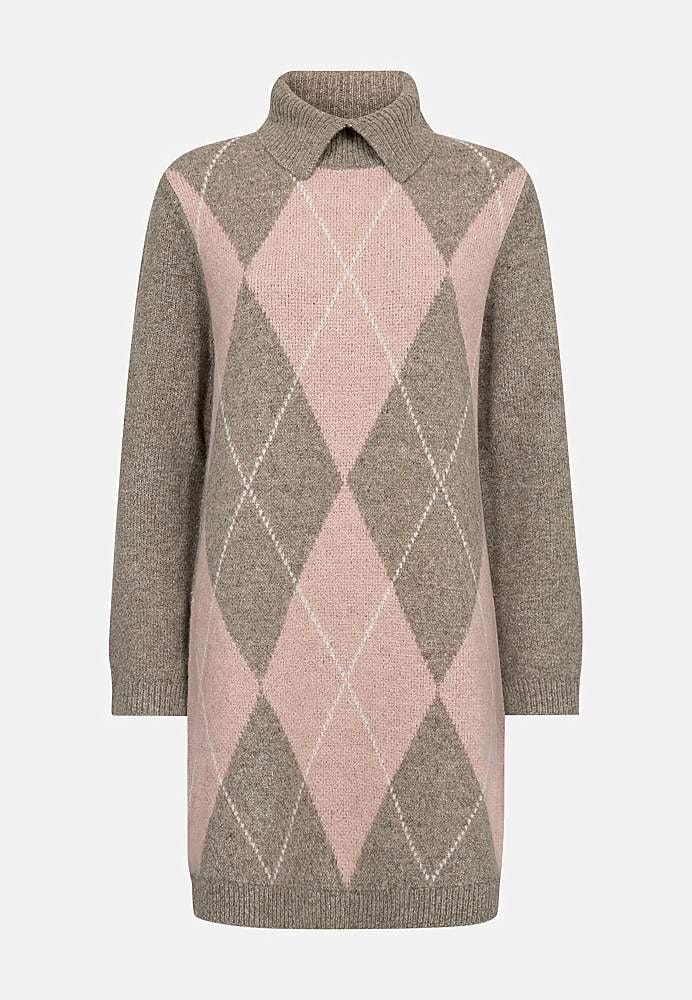 Pehme kootud tuunika. Sirge ja veidi avarama lõikega. Ees diagonaalselt ruuduline muster roosade ja beežide toonidega. Polokrae ja ees lõhik. Pikkade varrukate otstes soonikkoes kätised ja lõhikud. Sirge soonikkoes alläär ja külgedel lõhikud. Pikkus õlast u. 90 cm suurusel S (38).