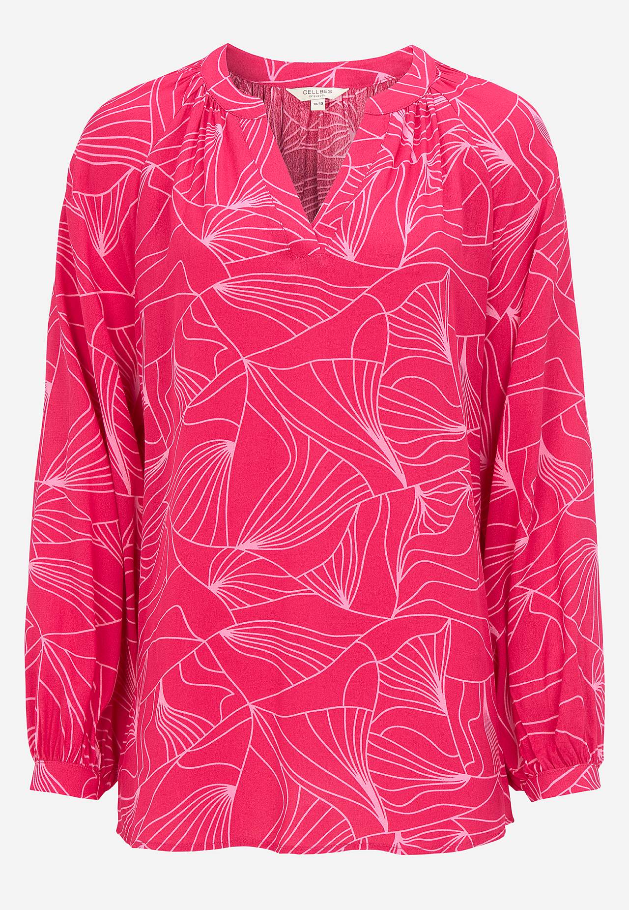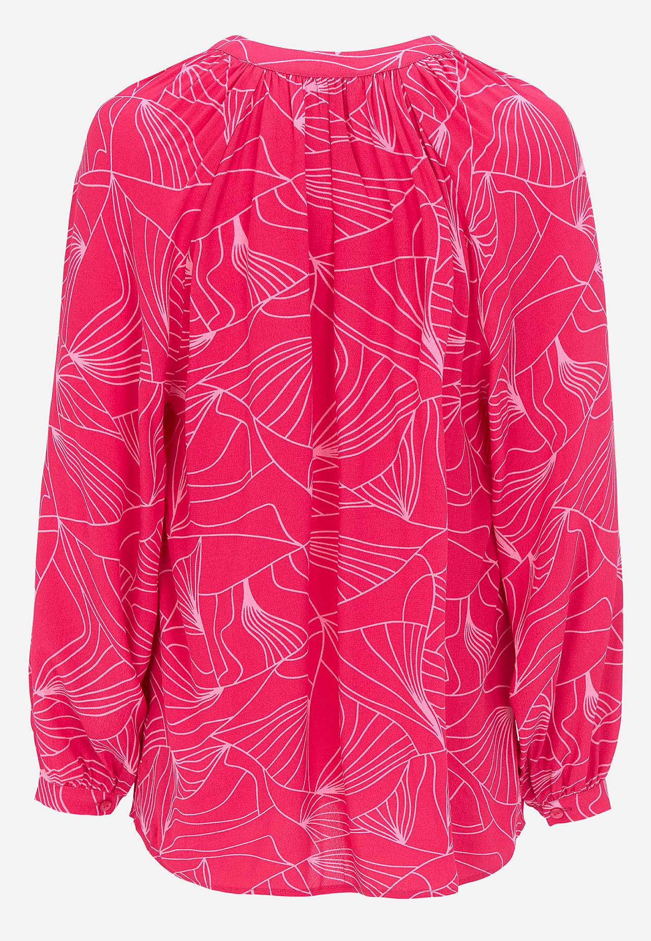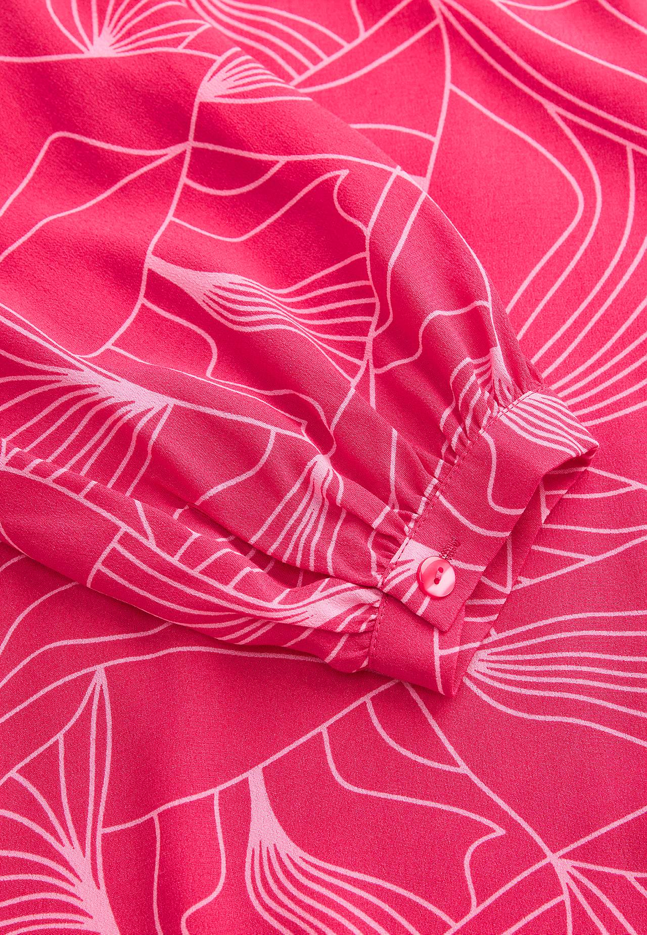 Kauni langevusega krepp-materjalist mustriline tuunika. Mati viimistluse ja kena struktuuriga. Pehme ja jahutava tundega. Tavasuurus, kena siluetiga. Ümar kaelus kergete voltidega ja kattuva V-kaelusega. Kergelt kaarjas alläär, tagant veidi pikem. Pikkus õlast vastavalt suurusele u. 72–85 cm.