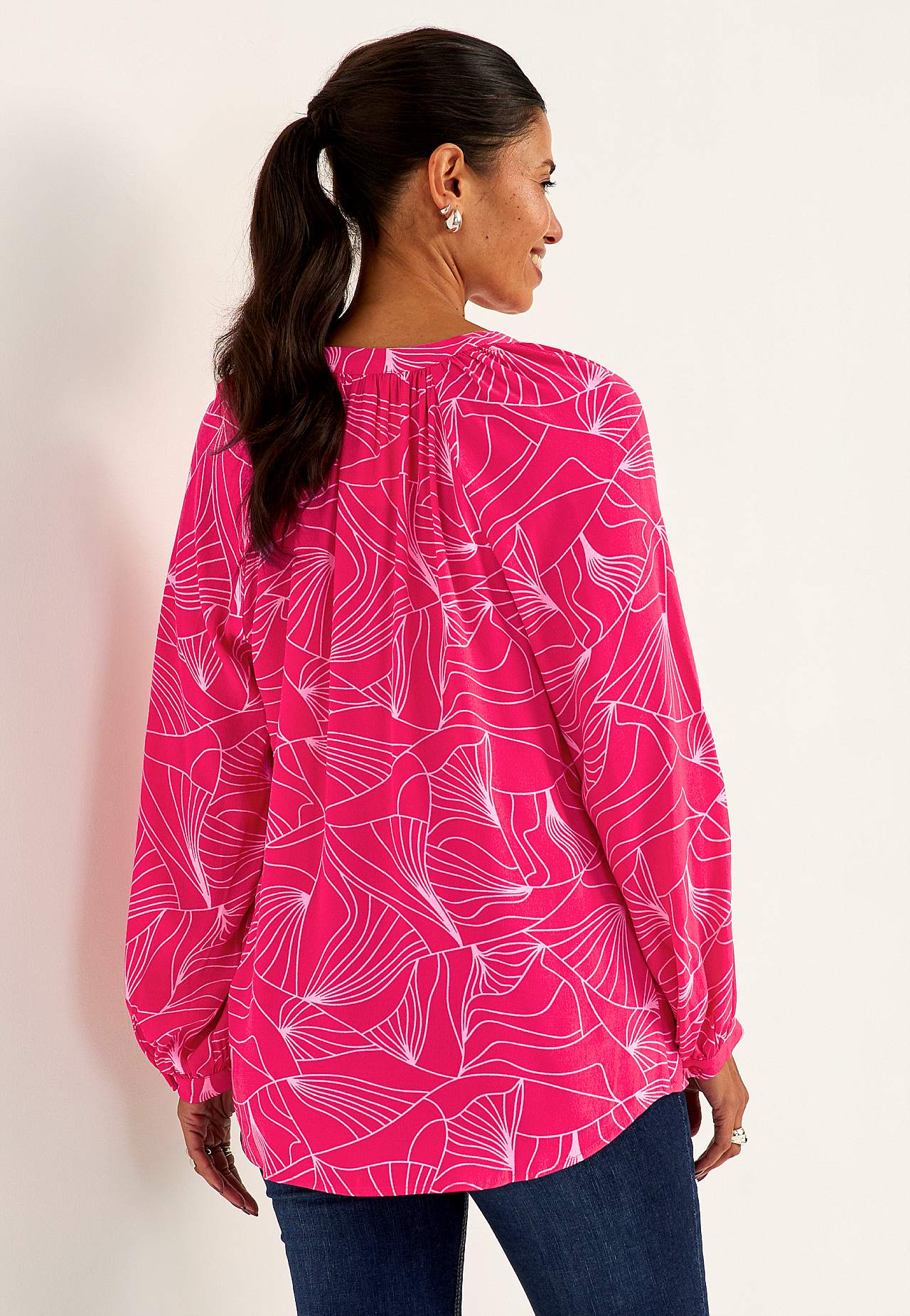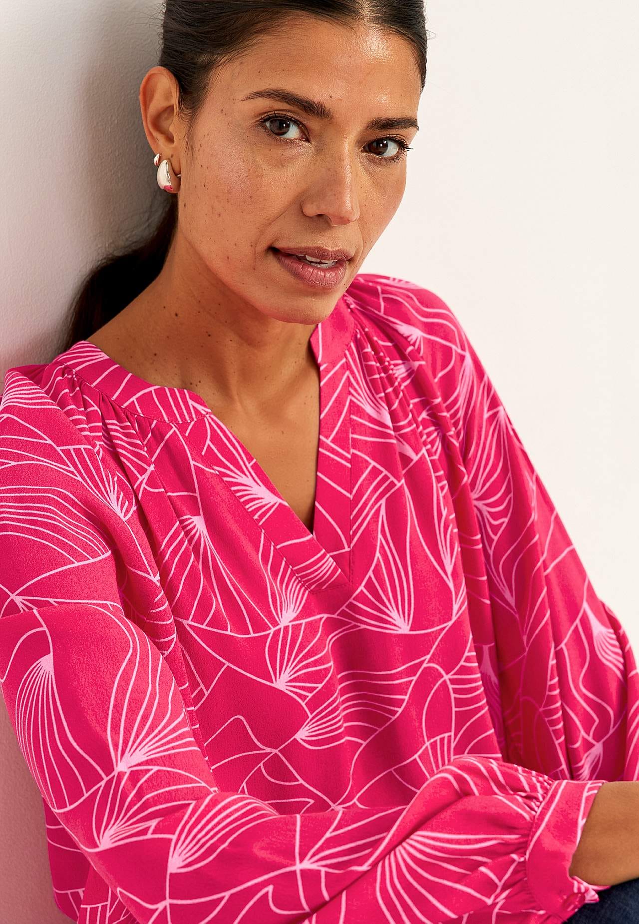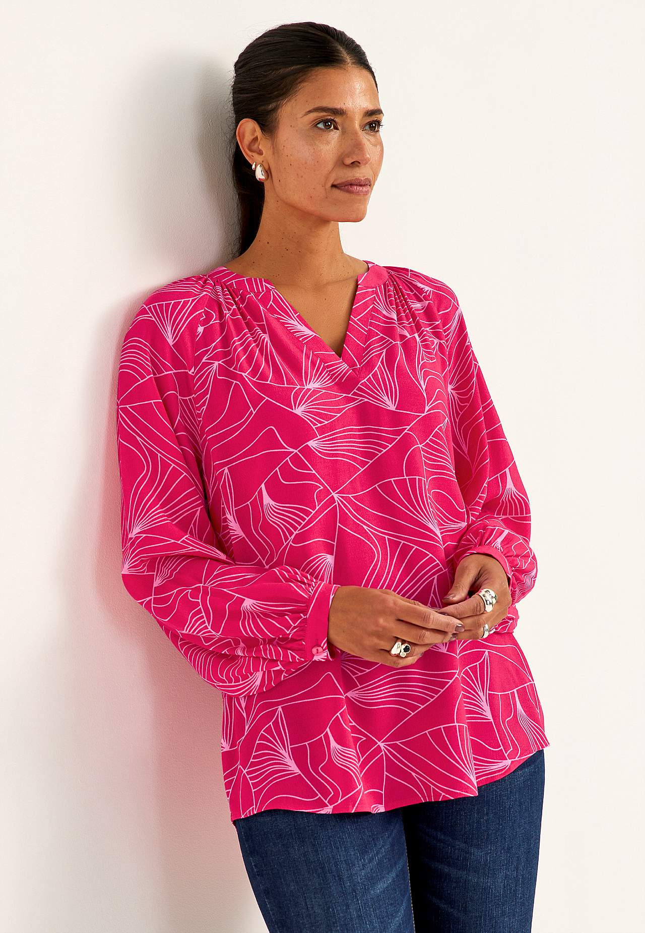 Kauni langevusega krepp-materjalist mustriline tuunika. Mati viimistluse ja kena struktuuriga. Pehme ja jahutava tundega. Tavasuurus, kena siluetiga. Ümar kaelus kergete voltidega ja kattuva V-kaelusega. Kergelt kaarjas alläär, tagant veidi pikem. Pikkus õlast vastavalt suurusele u. 72–85 cm.