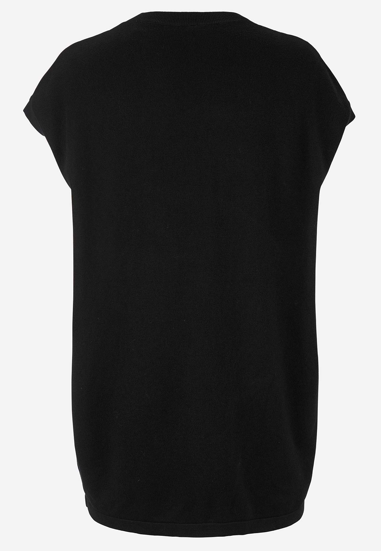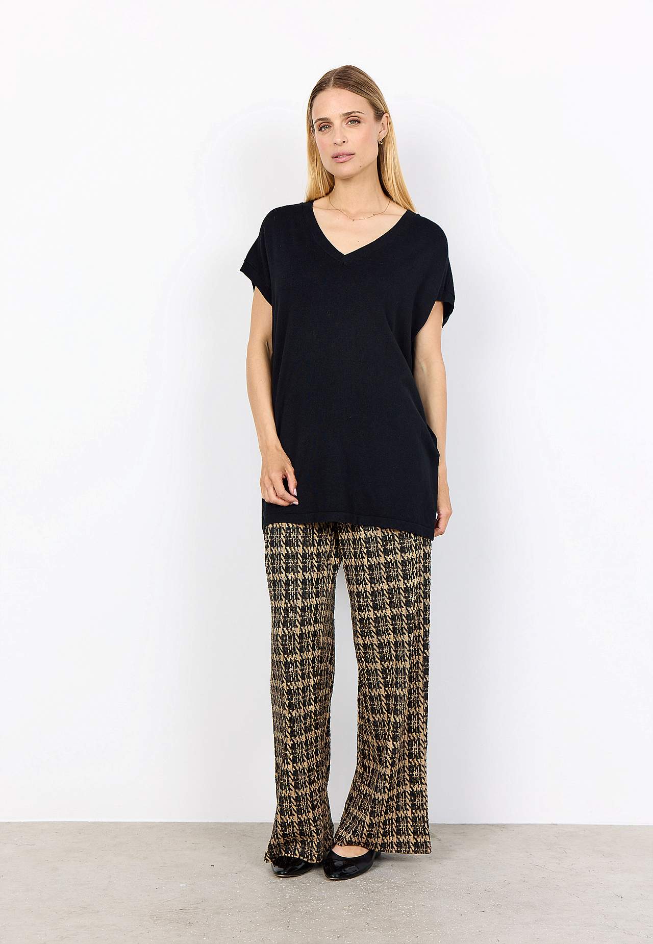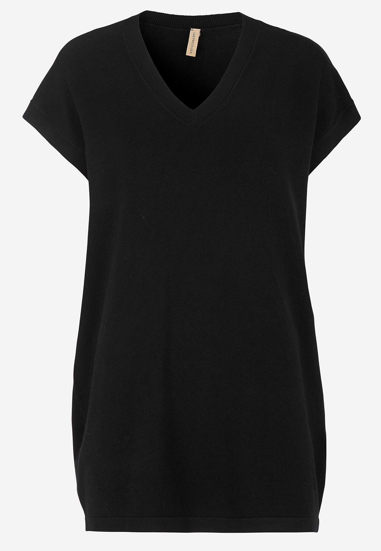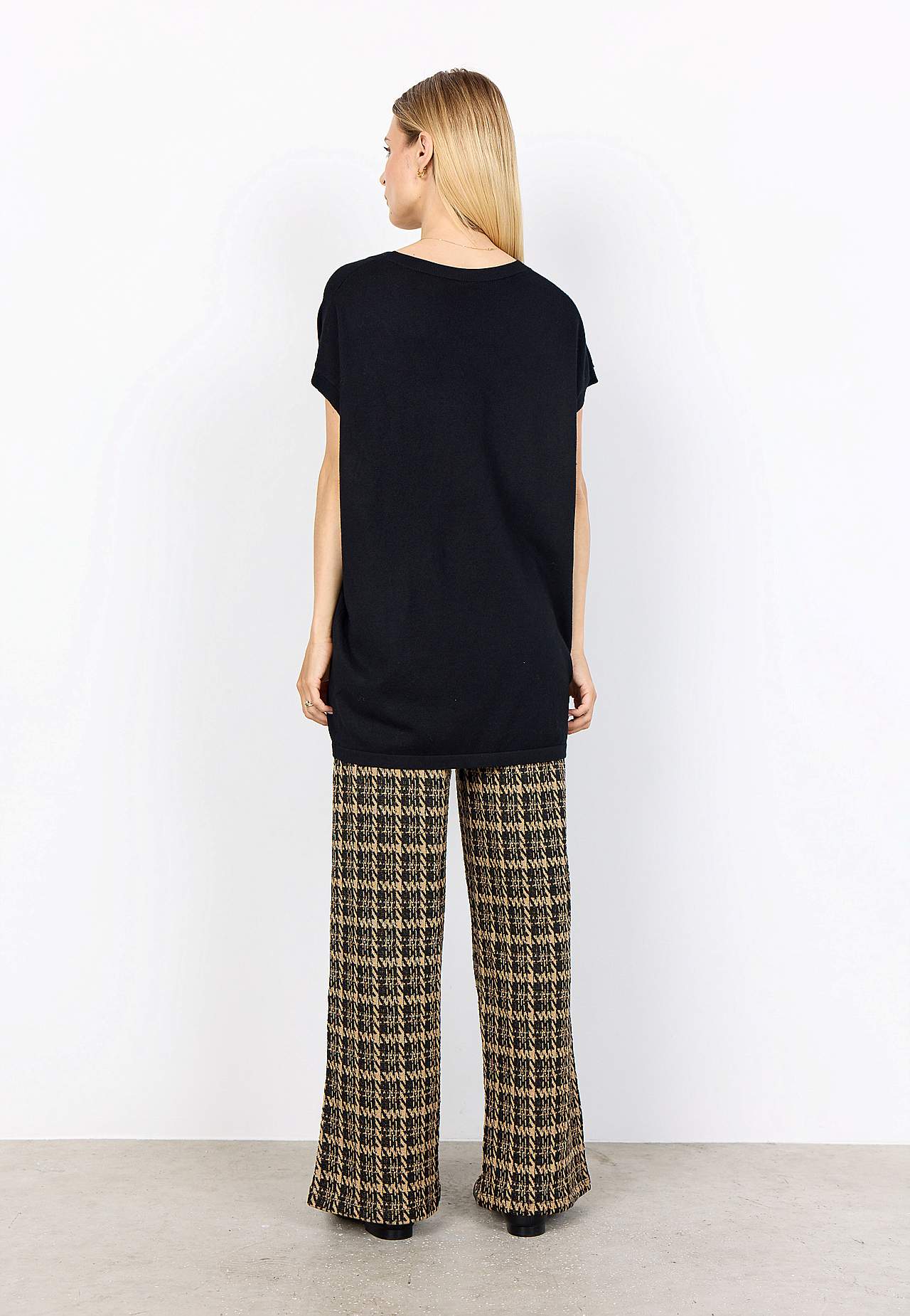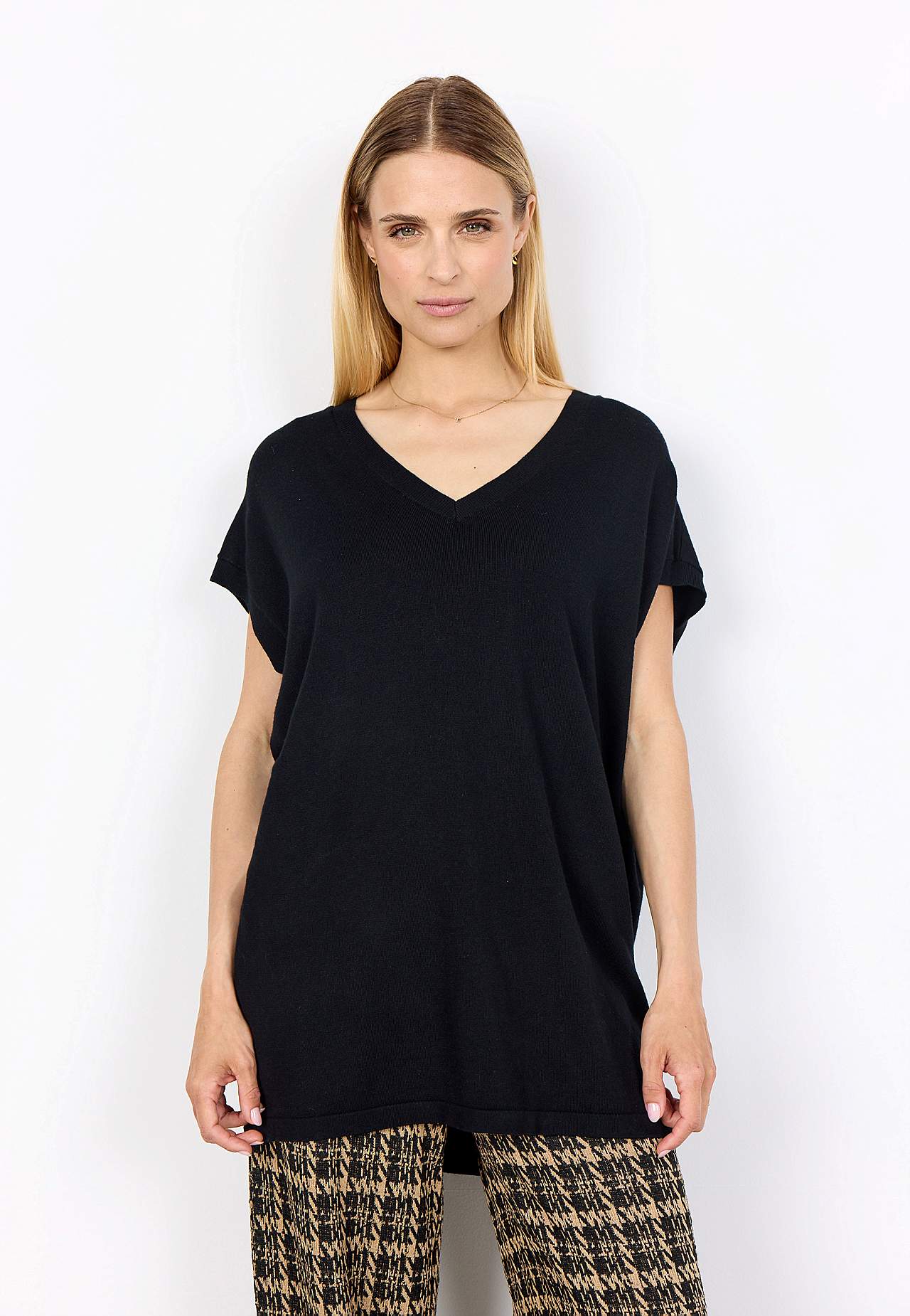 Kergelt läikiv peenkoes tuunika. Avar tegumood. Soonikkoes V-kaelus. Fully fashioned-kudum. Lühikeste varrukate otstes soonik. Käeavad kootud kujundatud kudumina. Sirge alläär. Pikkus õlast ca 79 cm suurusel S (38).
