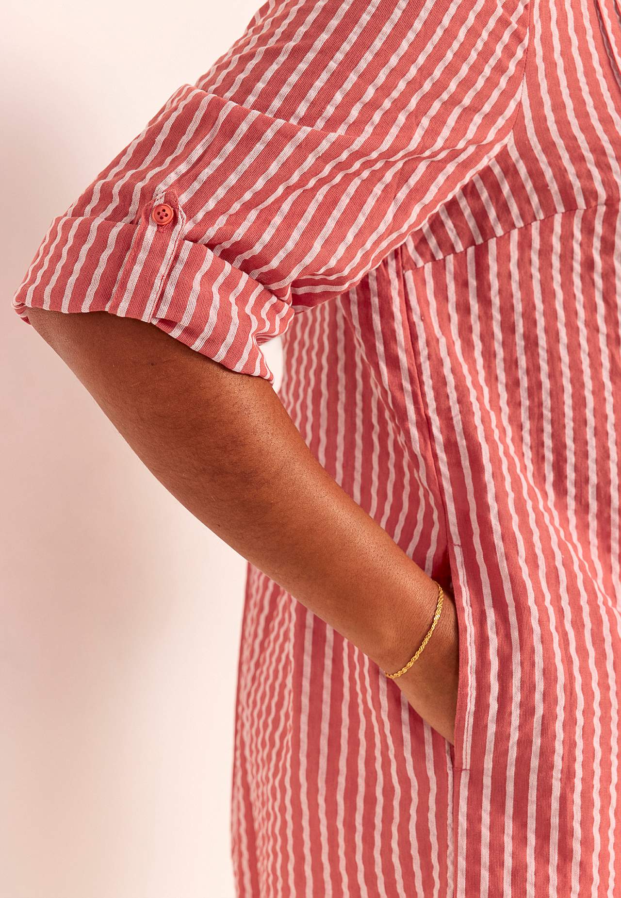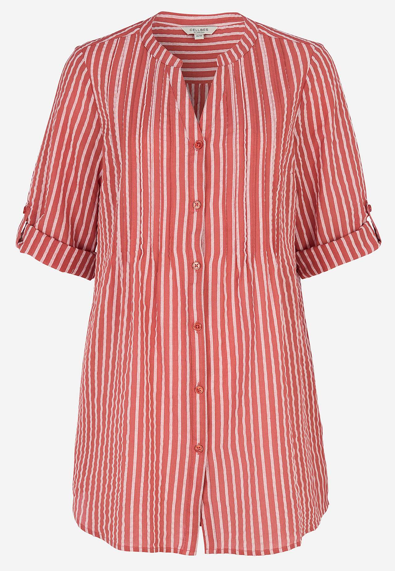 Dekoratiivsete nöörvoltidega õhuline tuunika. Mõnus kreppkangas. V-lõhikuga ümar kaelus. Nööbikinnis. Üleskeeratavatel laiadel kolmveerandpikkuses varrukatel nööp. Külgedel peidetud taskud. Taga kroogetega passe. Pikkus õlast vastavalt suurusele ca 82-94 cm.