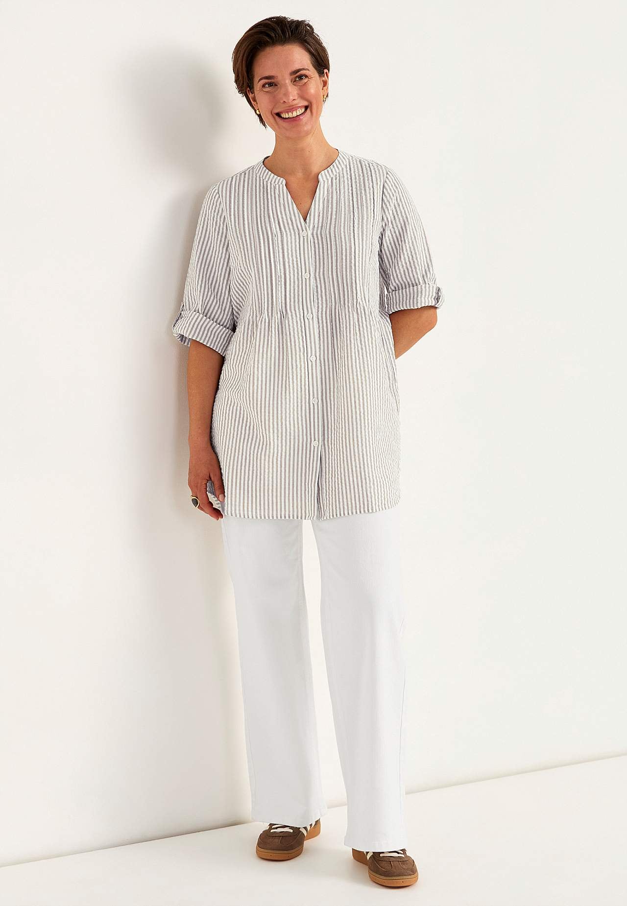Dekoratiivsete nöörvoltidega õhuline tuunika. Mõnus kreppkangas. V-lõhikuga ümar kaelus. Nööbikinnis. Üleskeeratavatel laiadel kolmveerandpikkuses varrukatel nööp. Külgedel peidetud taskud. Taga kroogetega passe. Pikkus õlast vastavalt suurusele ca 82-94 cm.