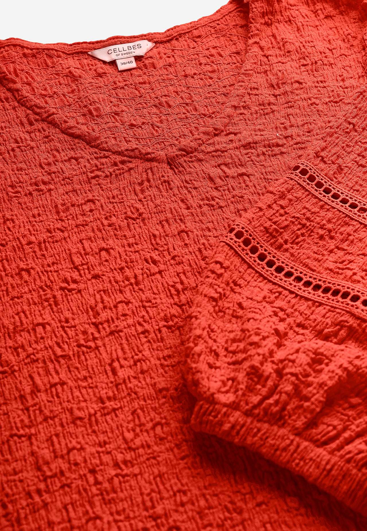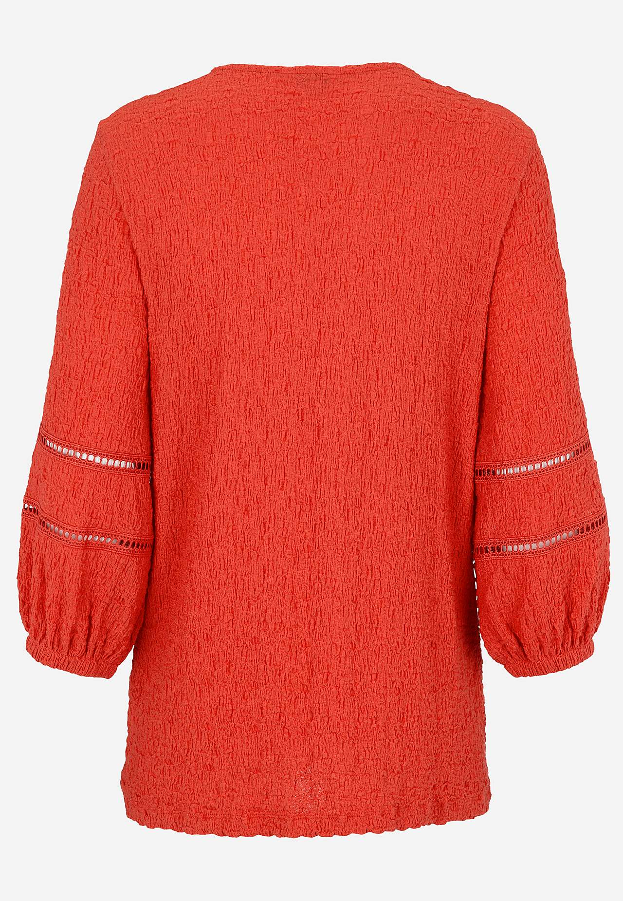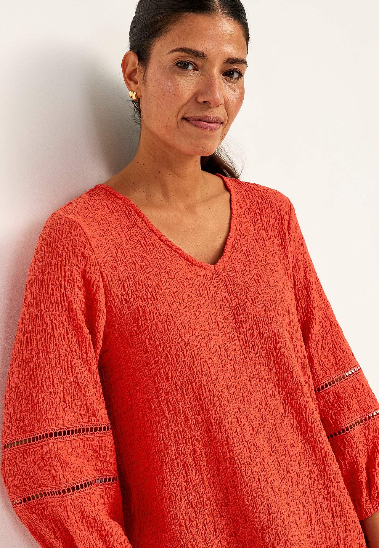 Mõnus, elastne puuvillasegusest struktuurse pinnaga kangas. Varrukatel kaunid detailid aukmustriga. Sirge tegumood, kergelt taljes. V-kaelus. Laiad 3/4 varrukad, mille otstes mansett ja dekoratiivsed aukmustriga õmblused. Sirge alläär. Seljapikkus vastavalt suurusele umbes 72-80 cm.