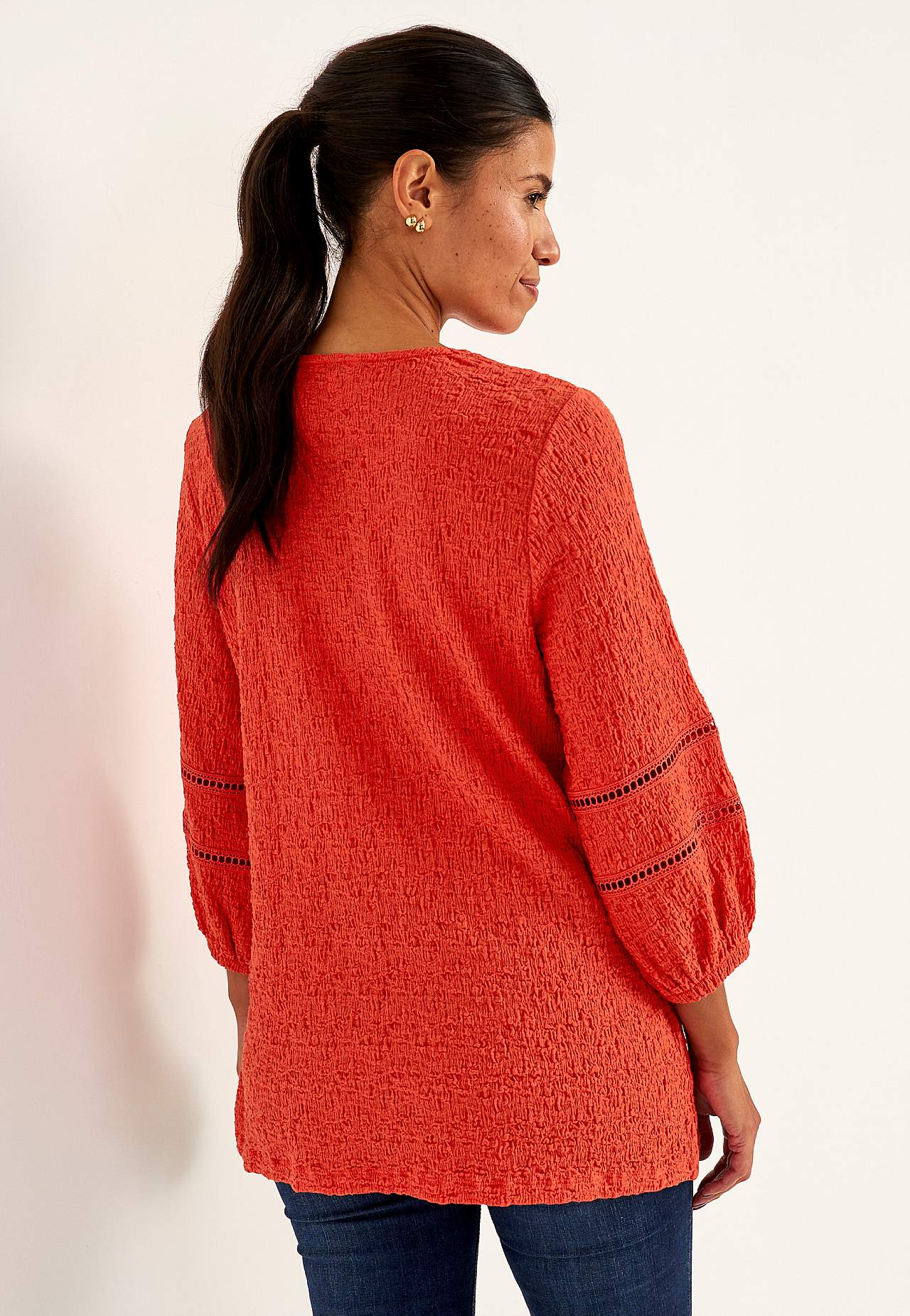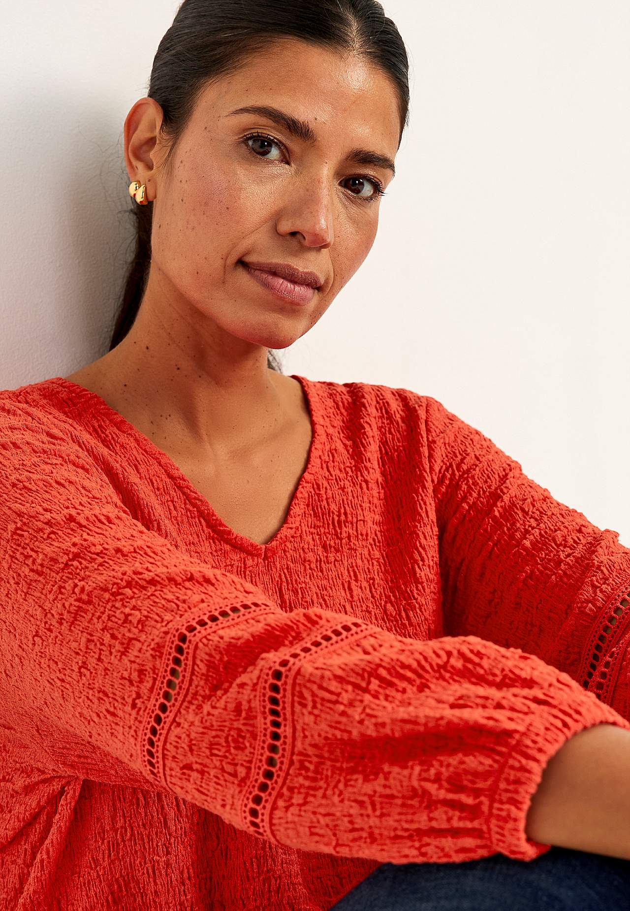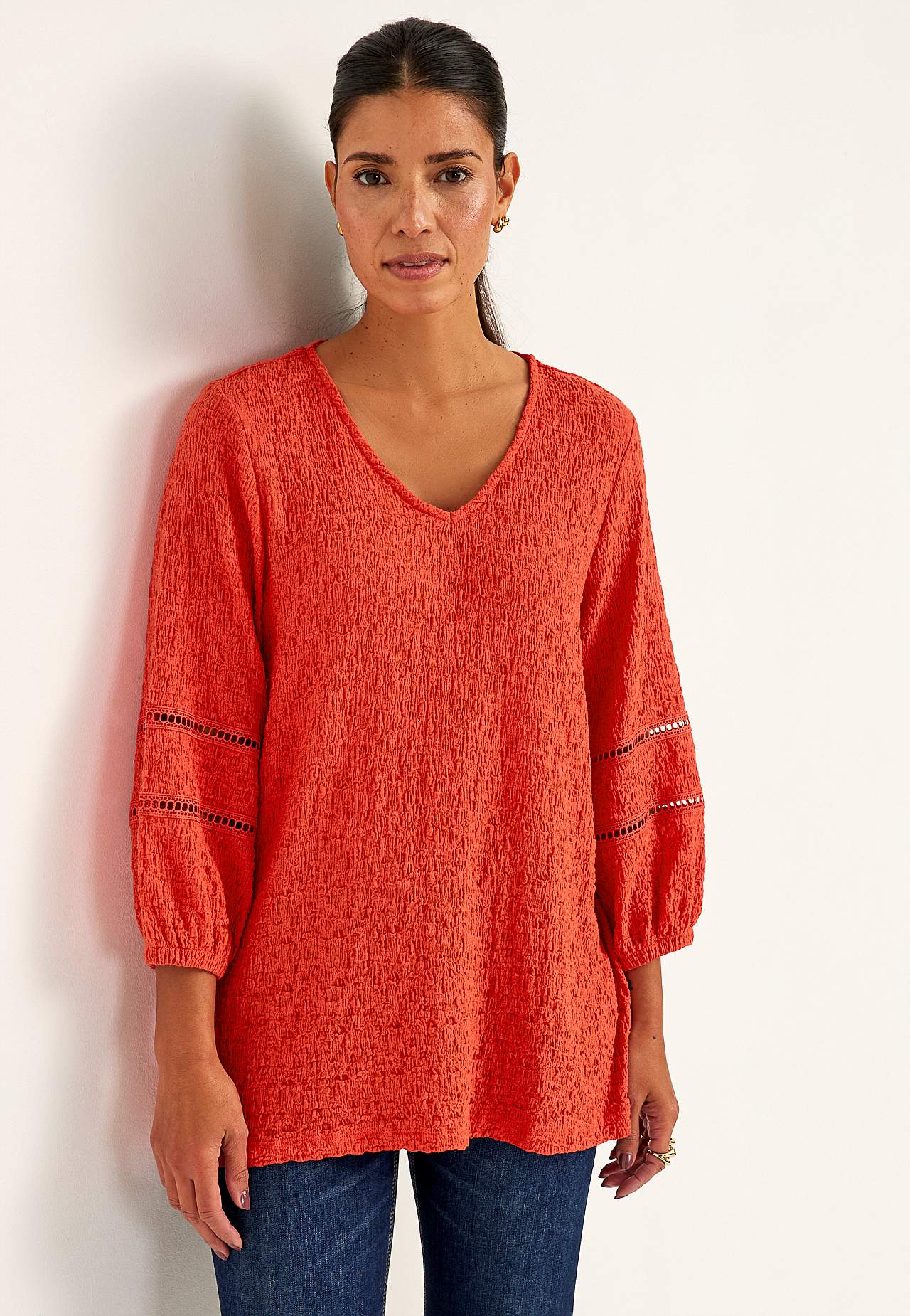 Mõnus, elastne puuvillasegusest struktuurse pinnaga kangas. Varrukatel kaunid detailid aukmustriga. Sirge tegumood, kergelt taljes. V-kaelus. Laiad 3/4 varrukad, mille otstes mansett ja dekoratiivsed aukmustriga õmblused. Sirge alläär. Seljapikkus vastavalt suurusele umbes 72-80 cm.