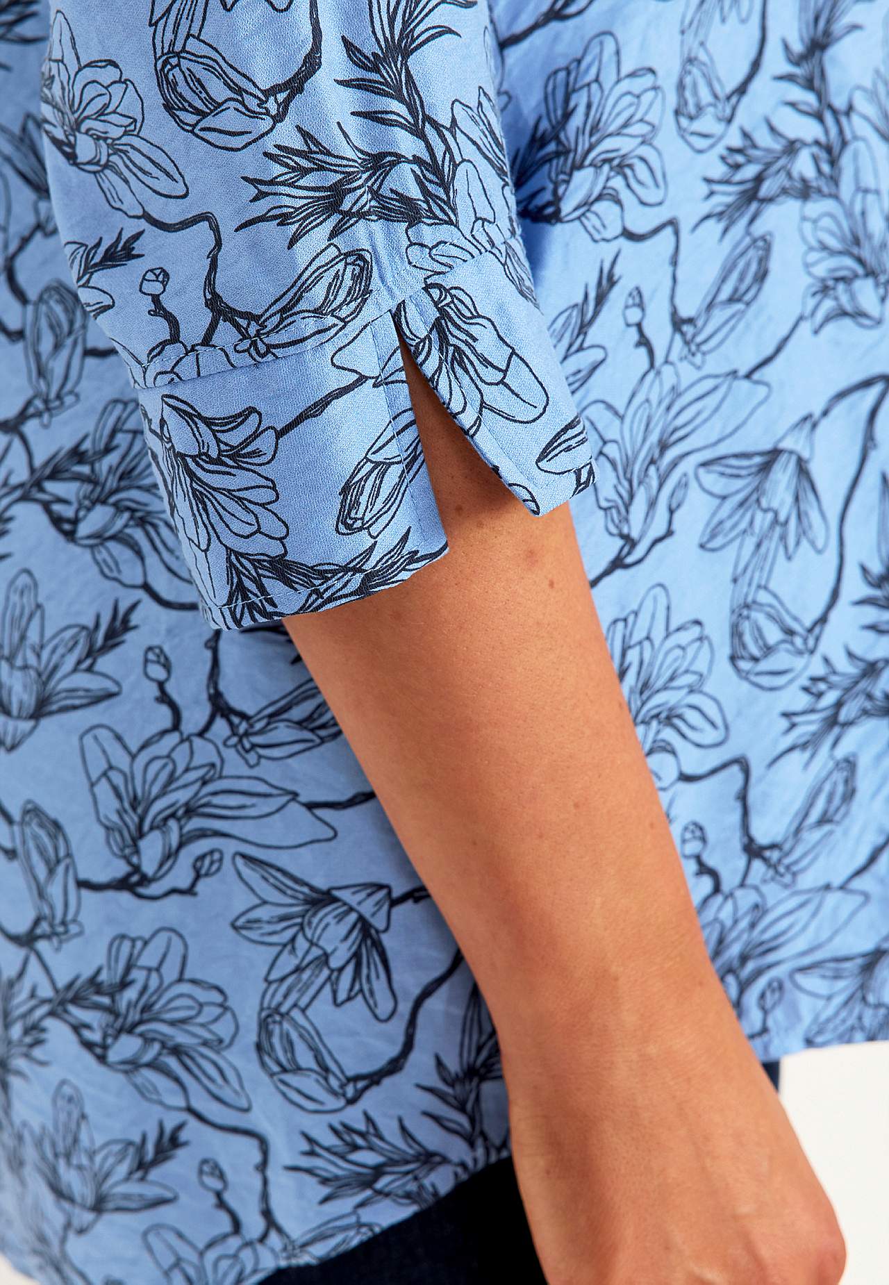 Kergelt struktuurkoes ja veidi läikivama pinnaga viskooskangast tuunika. Ilusa langevusega jahe materjal. Kergelt A-lõikeline tegumood. Pikendatud õlaosa. Pikkus õlast vastavalt suurusele u. 79-86 cm.