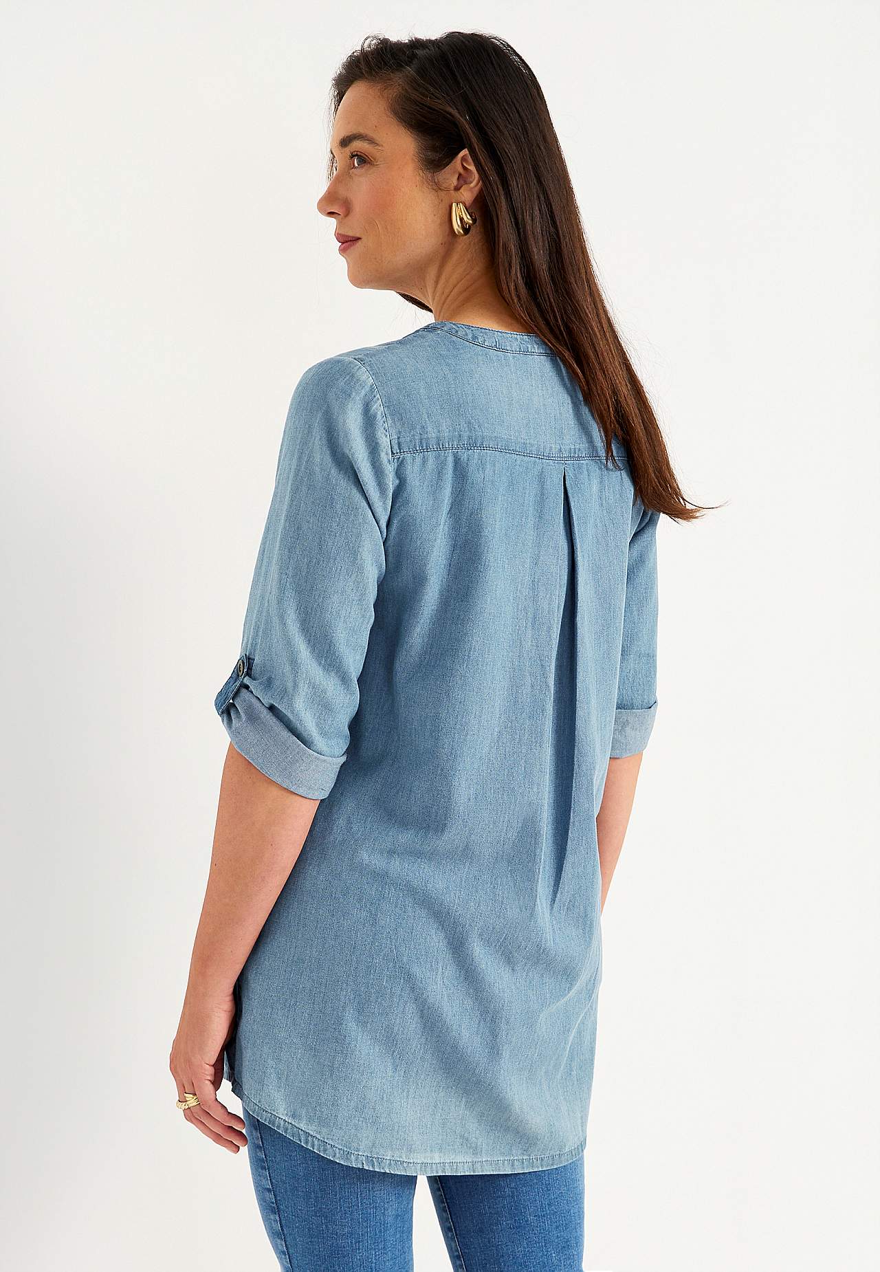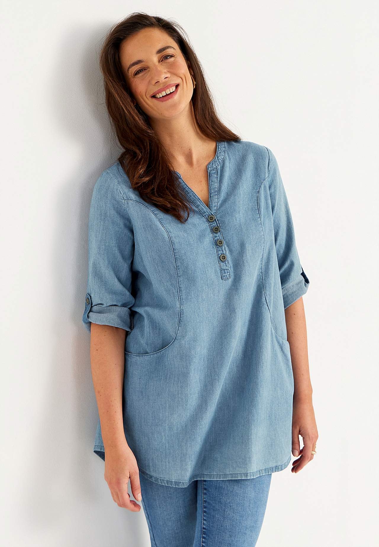 Pehmest denimkangast kergelt a-lõikeline tuunika. V-lõike ja nööbiliistuga ümar kaelus. Mahukad küljetaskud. Üleskeeratavate kolmveerandvarrukate otstes liist ja nööp. Kroogetega passe taga. Pikkus õlast vastavalt suurusele ca 84-96 cm.