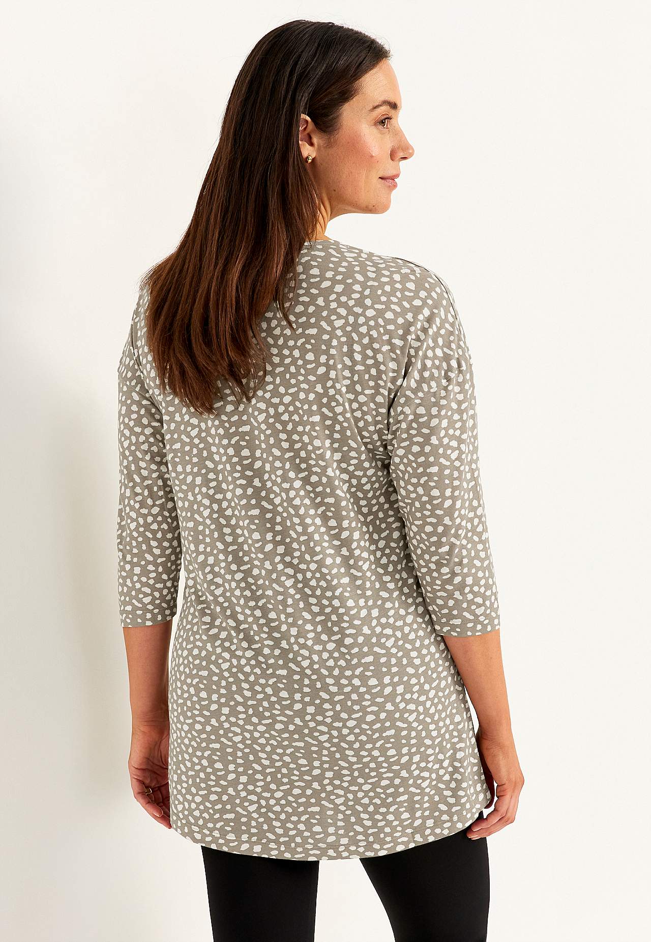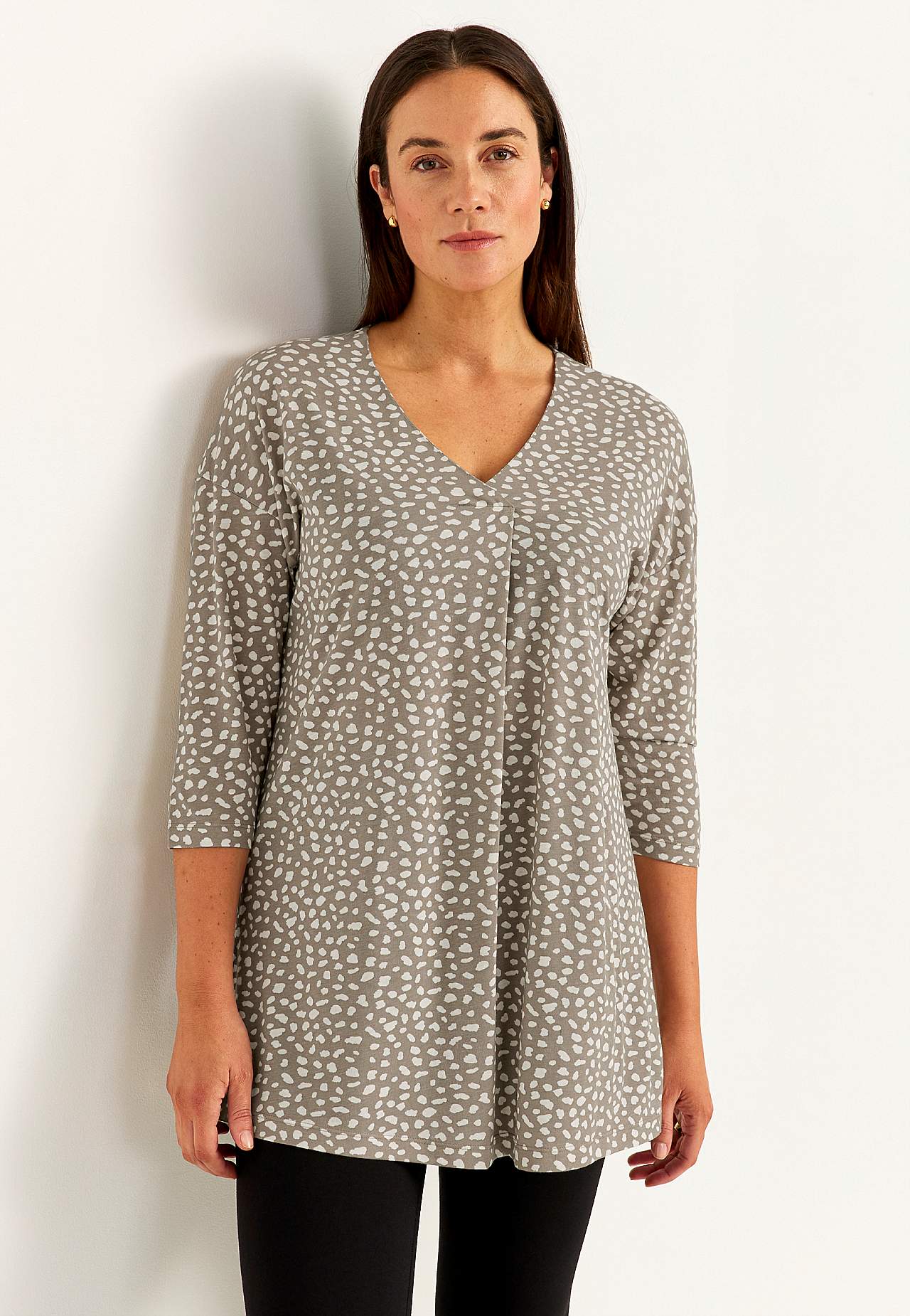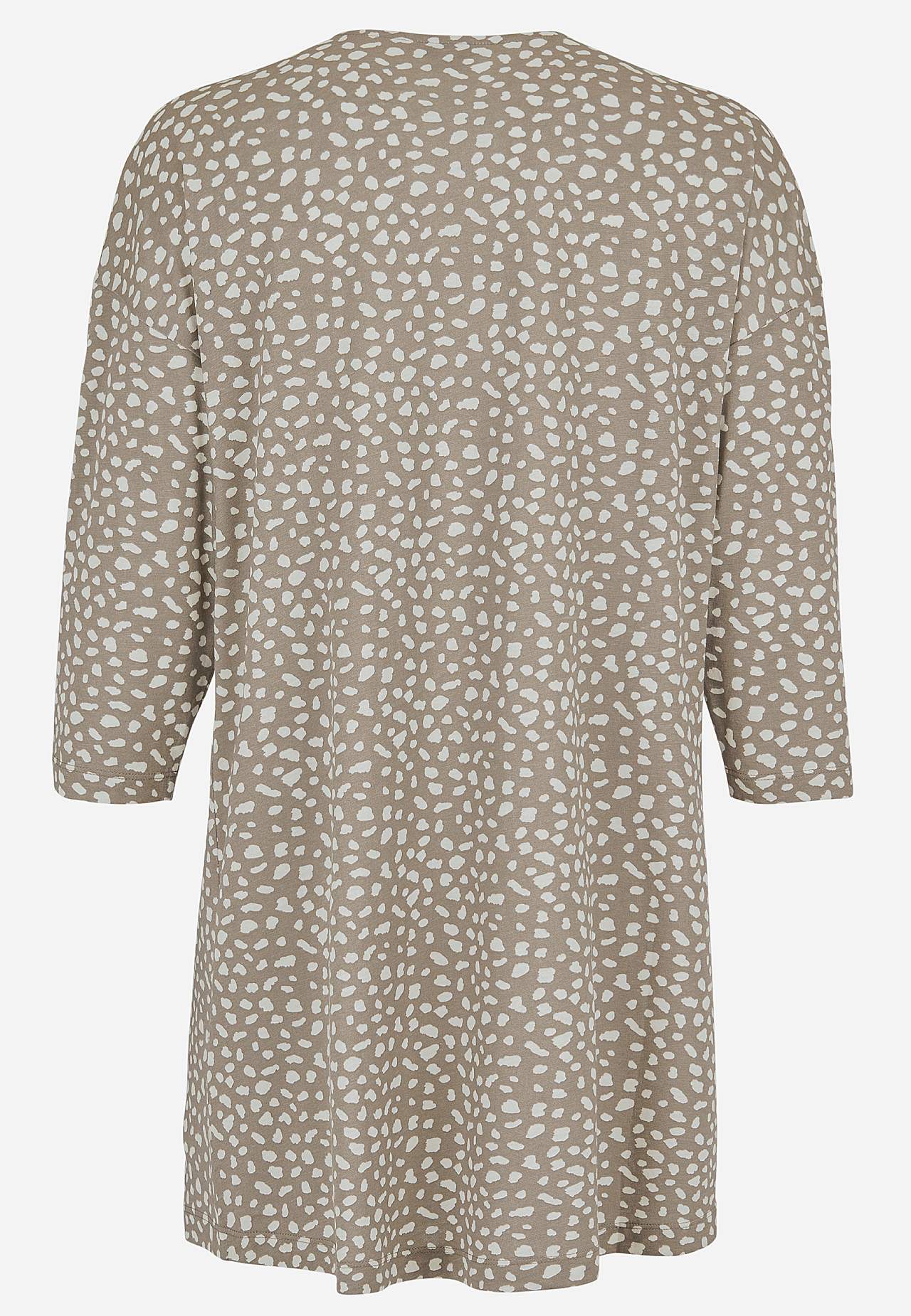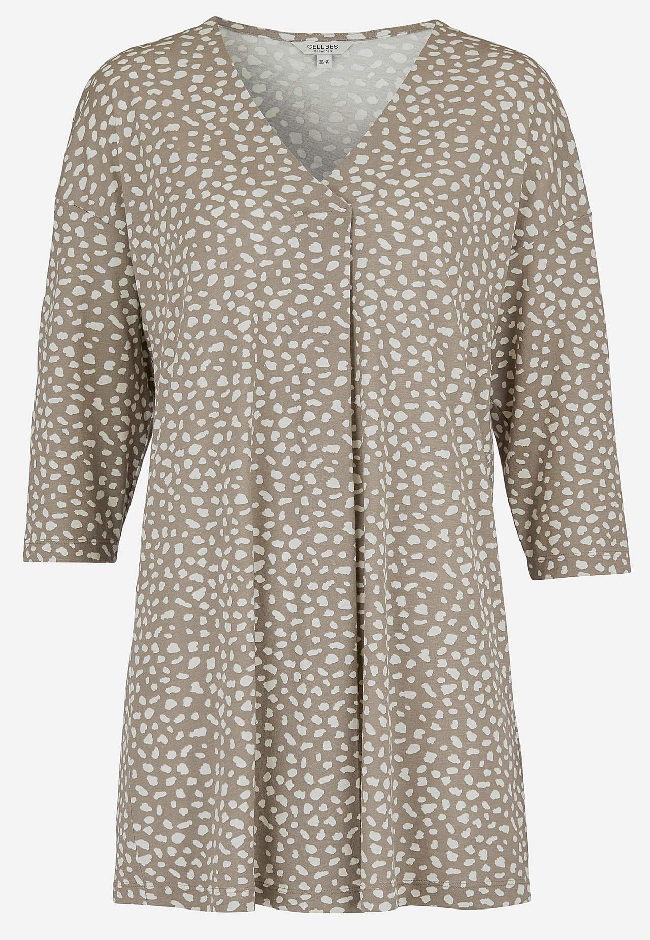 Pehme, kauni langevusega puuvilla- ja viskoosisegusest materjalist tuunika. Avar lõige. A-lõikeline. V-kaelus dekoratiivse voldiga. Pikendatud õlaosa. 3/4 pikkuses varrukad. Kaarjas alläär. Pikkus õlast vastavalt suurusele u 79-89 cm.