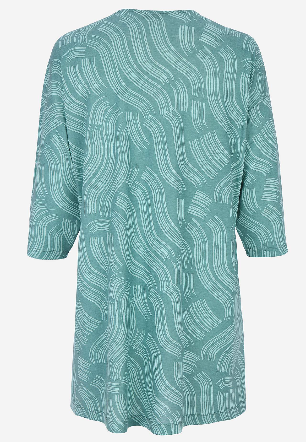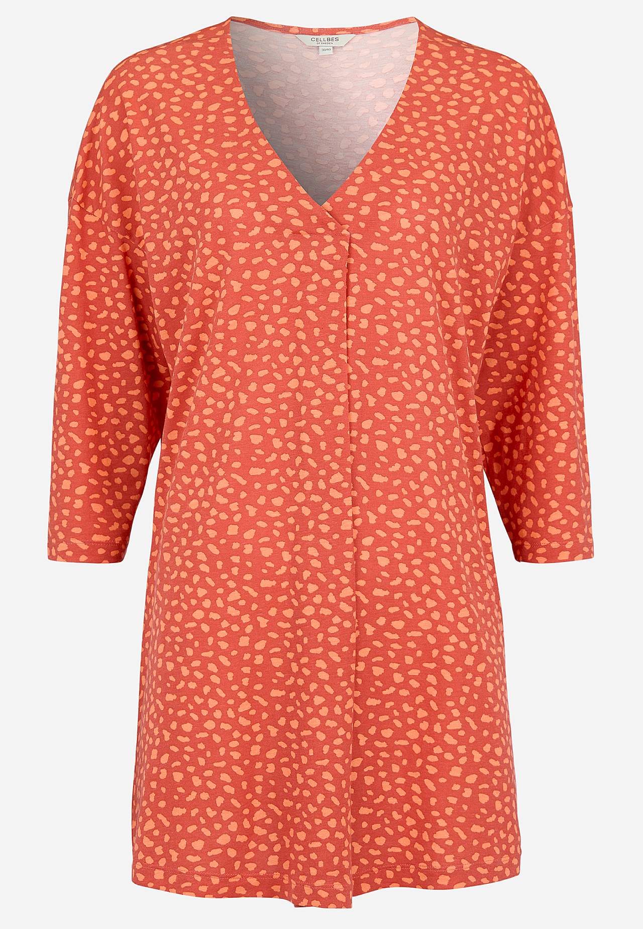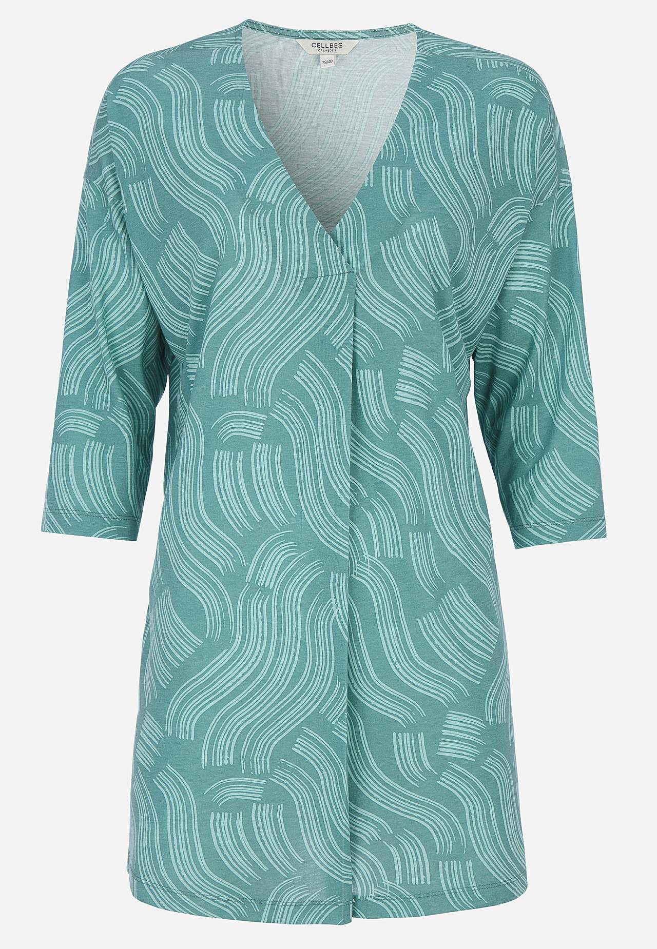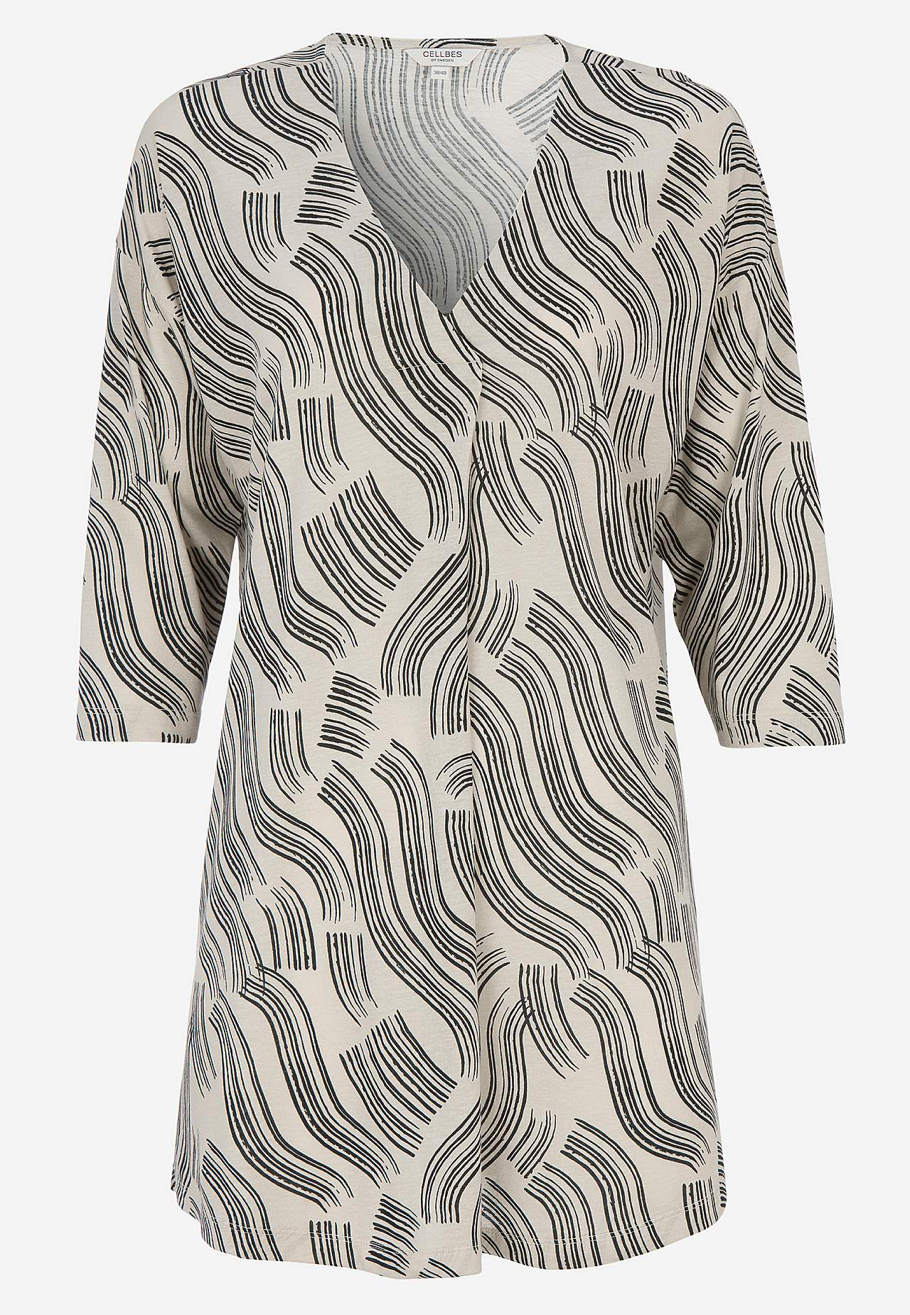 Pehme, kauni langevusega puuvilla- ja viskoosisegusest materjalist tuunika. Avar lõige. A-lõikeline. V-kaelus dekoratiivse voldiga. Pikendatud õlaosa. 3/4 pikkuses varrukad. Kaarjas alläär. Pikkus õlast vastavalt suurusele u 79-89 cm.