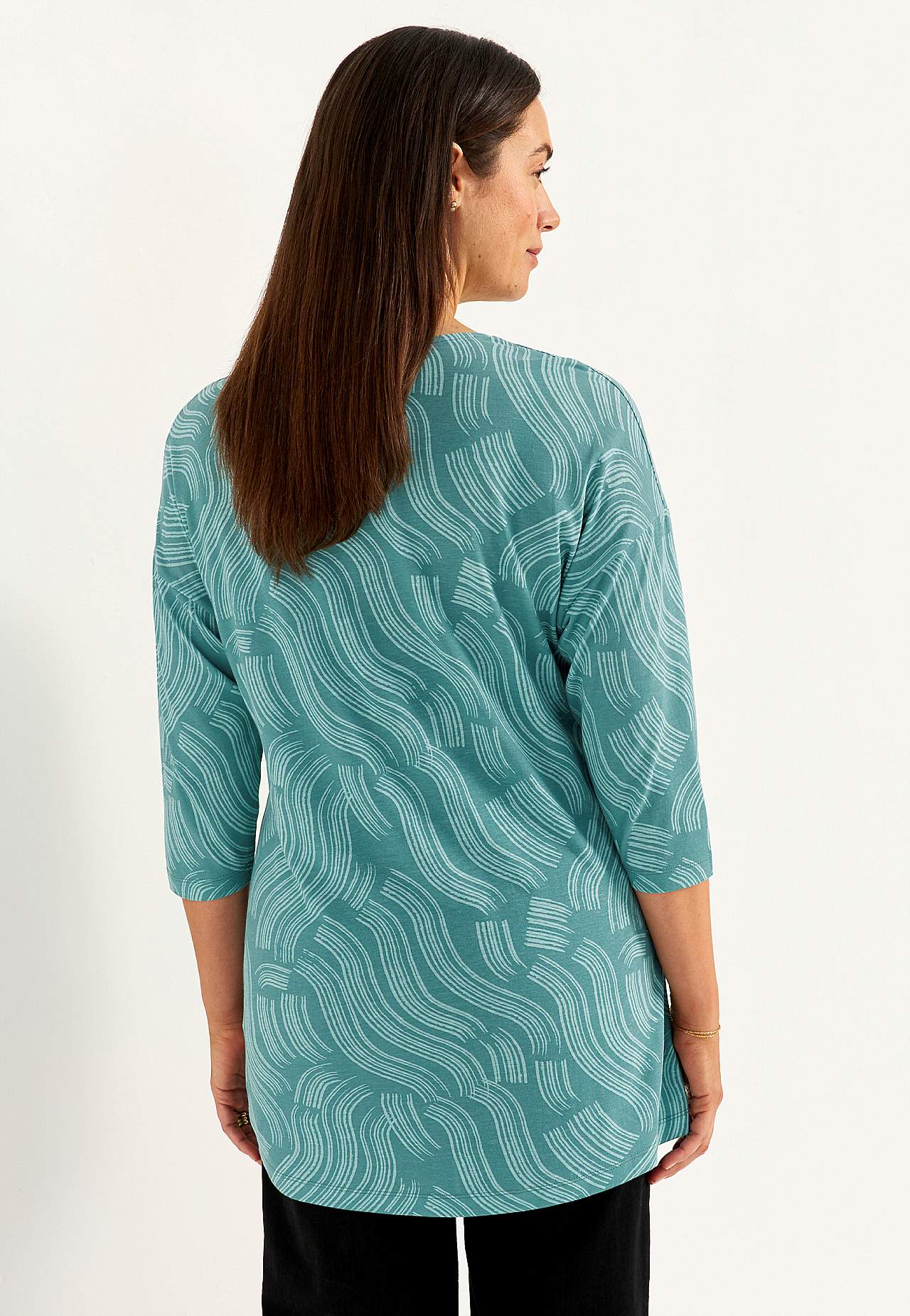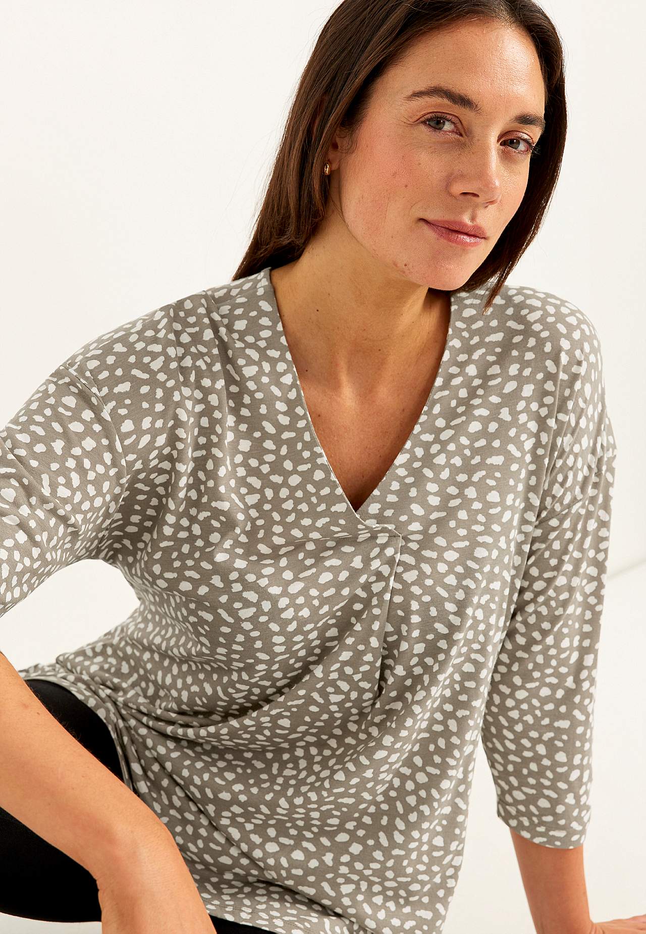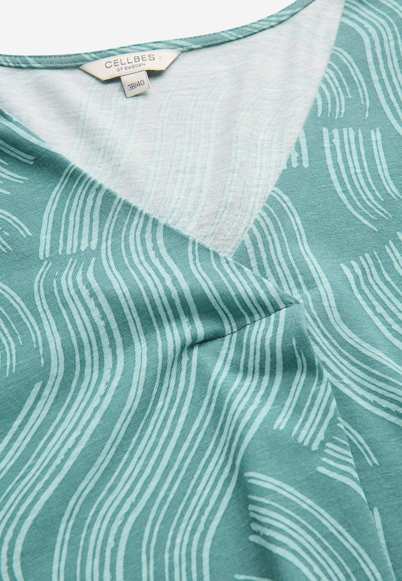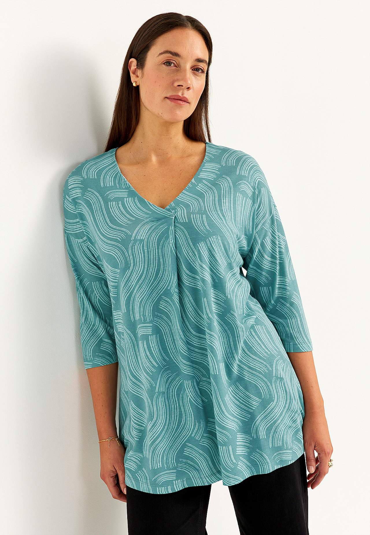 Pehme, kauni langevusega puuvilla- ja viskoosisegusest materjalist tuunika. Avar lõige. A-lõikeline. V-kaelus dekoratiivse voldiga. Pikendatud õlaosa. 3/4 pikkuses varrukad. Kaarjas alläär. Pikkus õlast vastavalt suurusele u 79-89 cm.