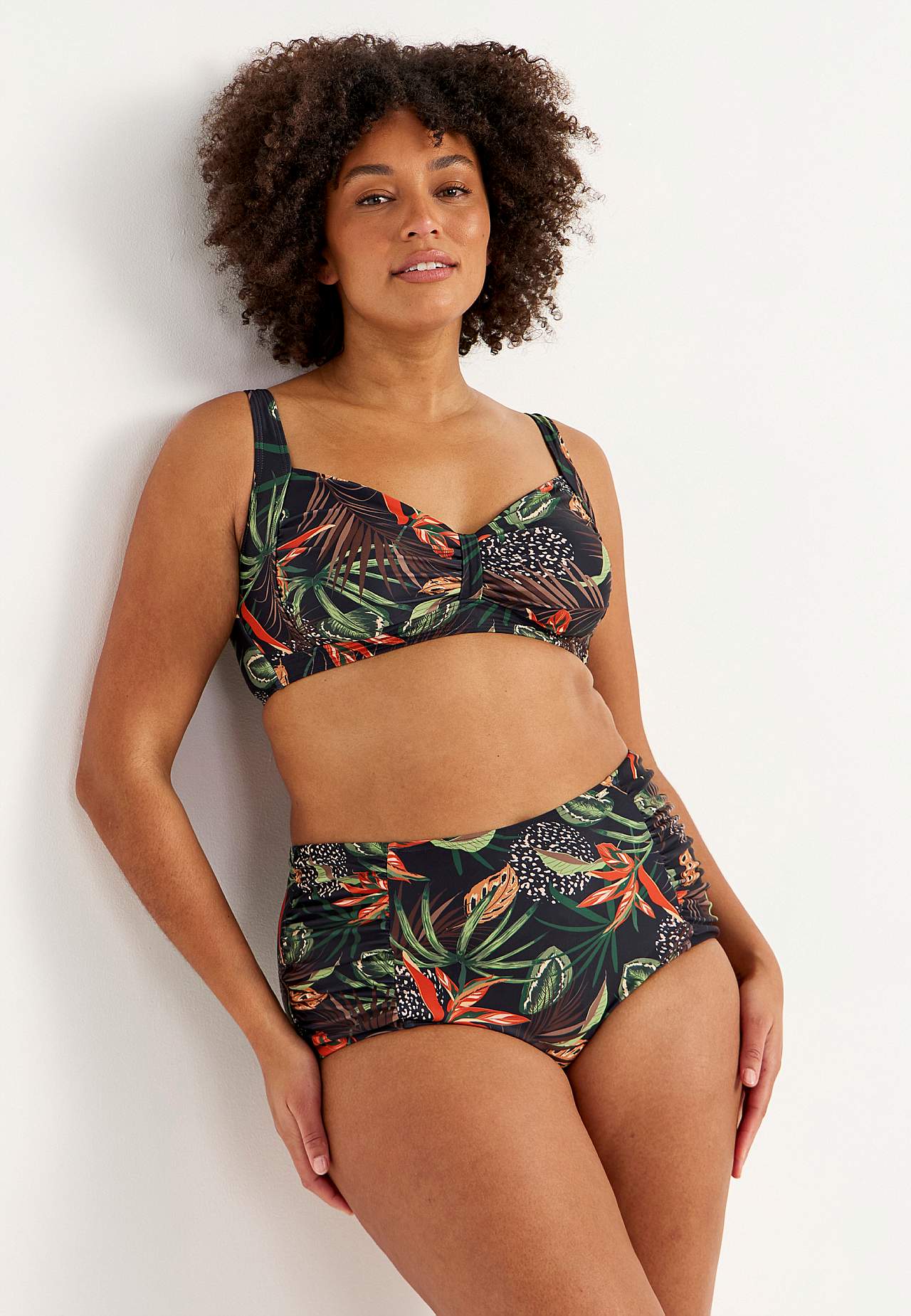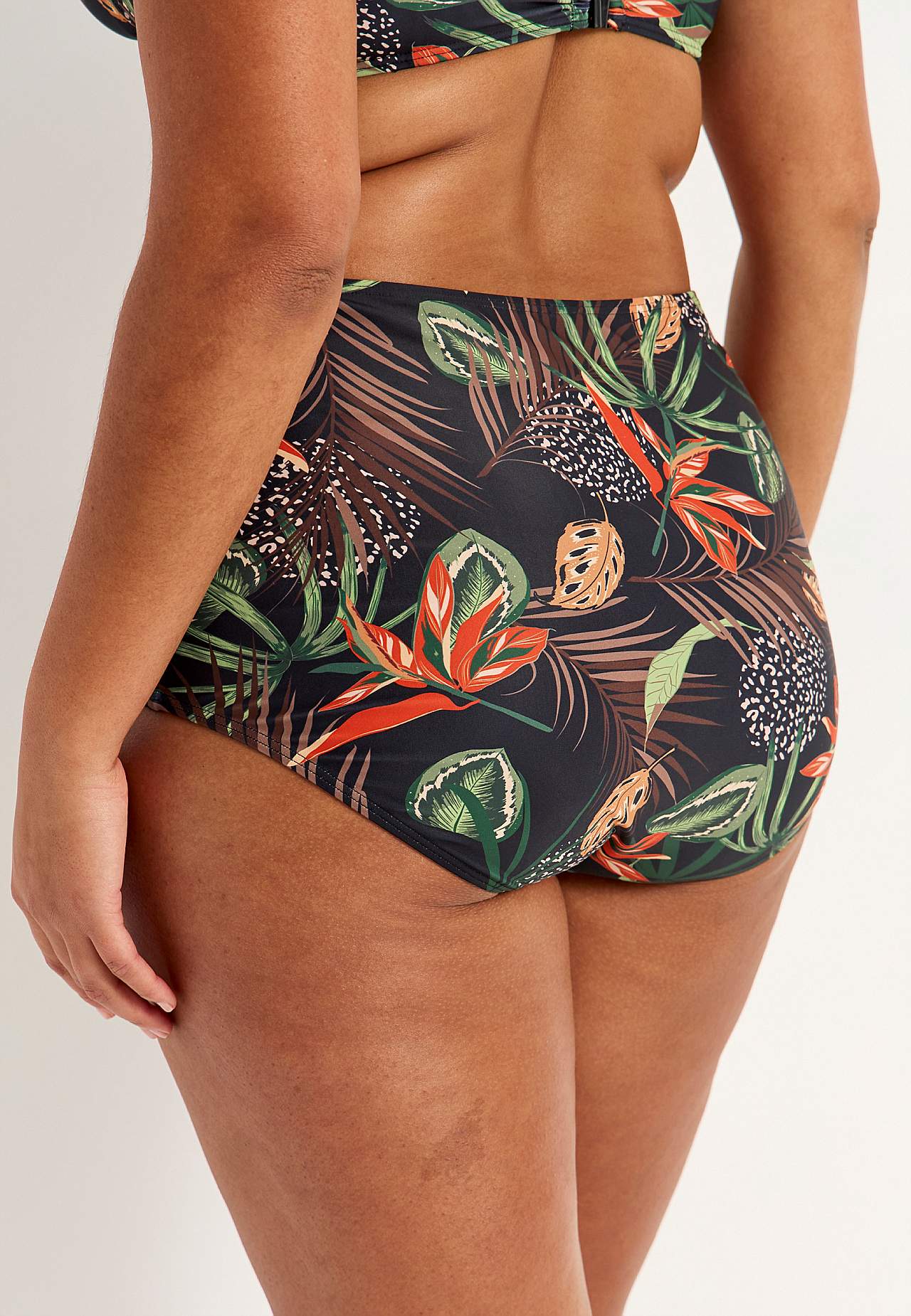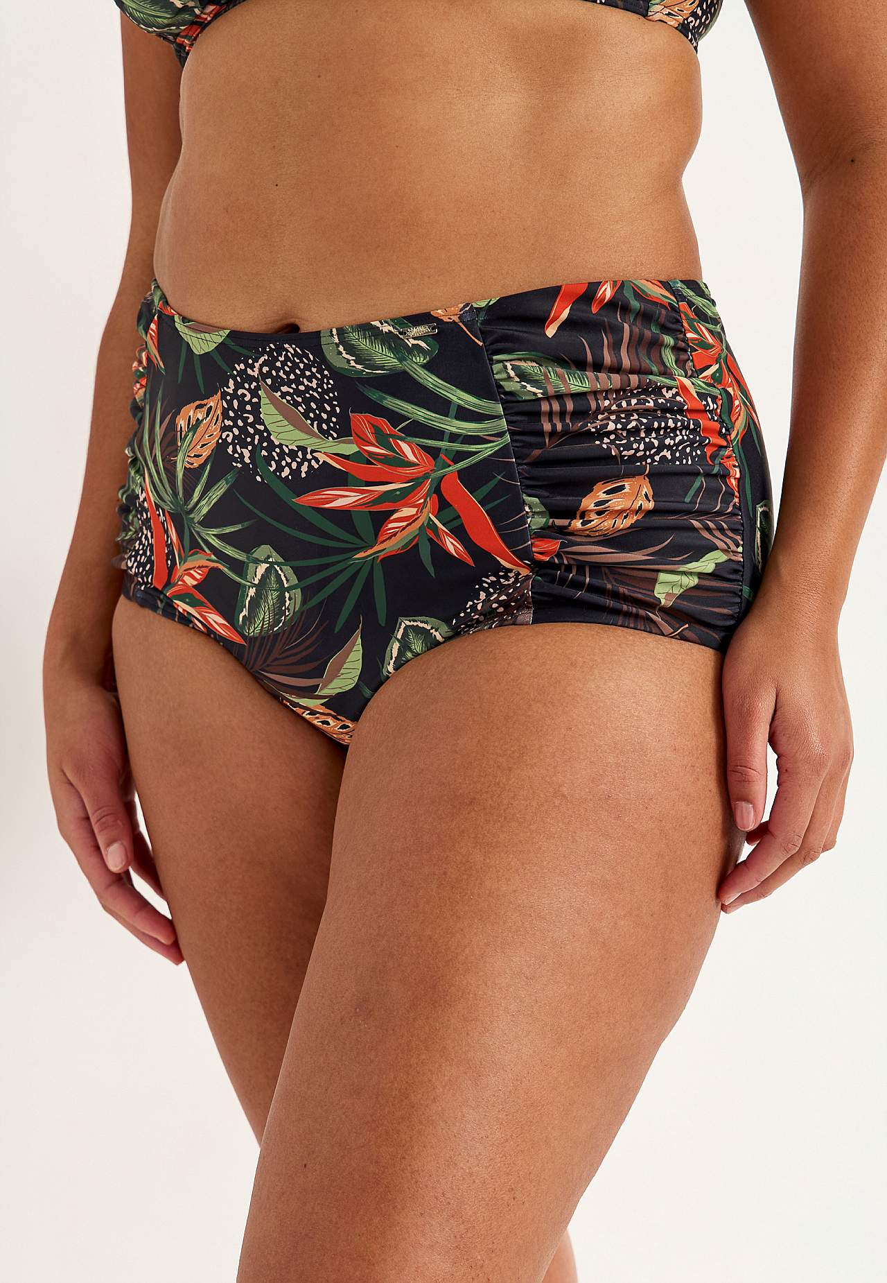 Ümbertöödeldud polüestrist bikiinipüksid. Kõrge värvel. Kaunis muster nii ees kui taga. Külgedel kena dekoratiivne drapeering. Täisvooder.