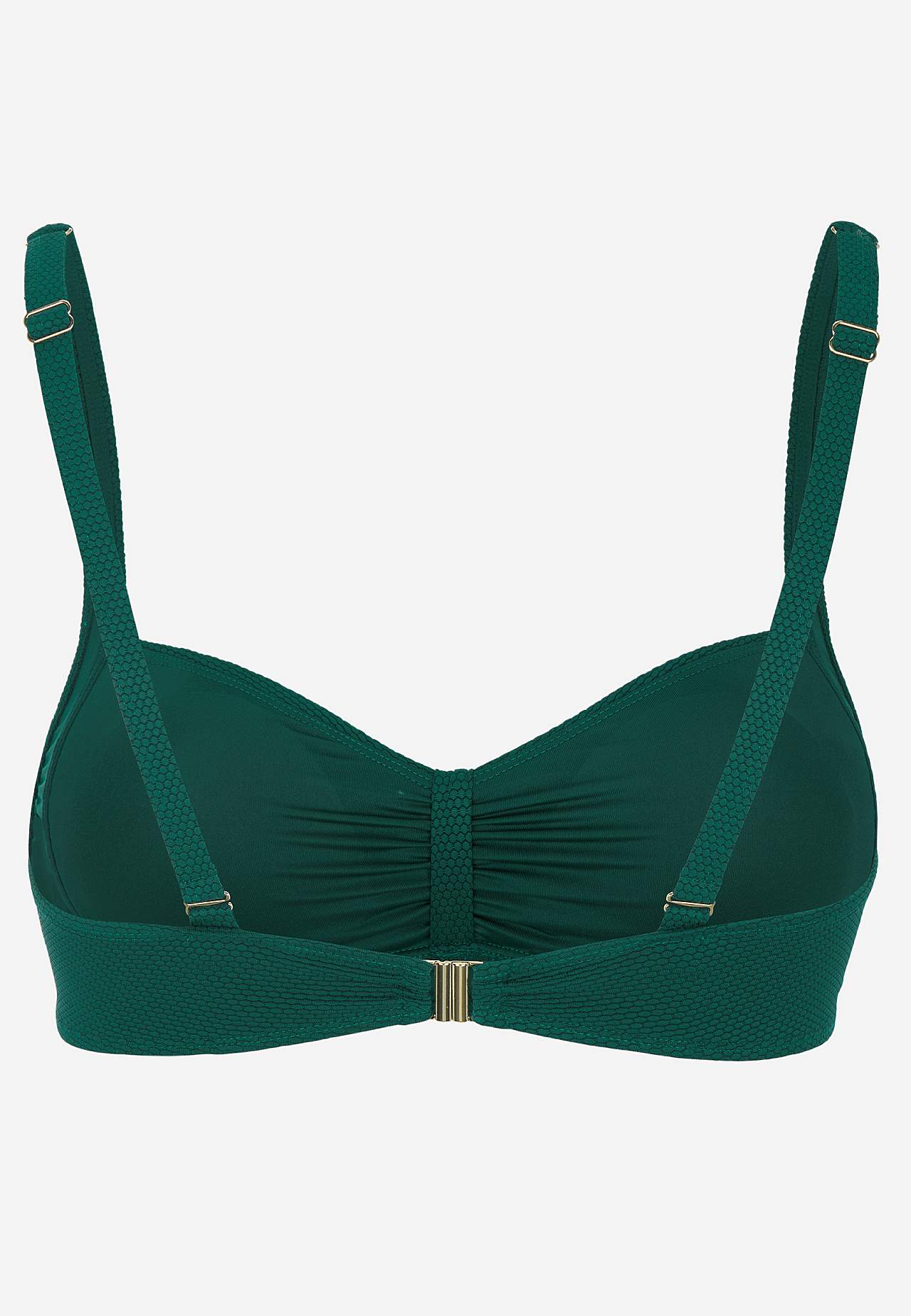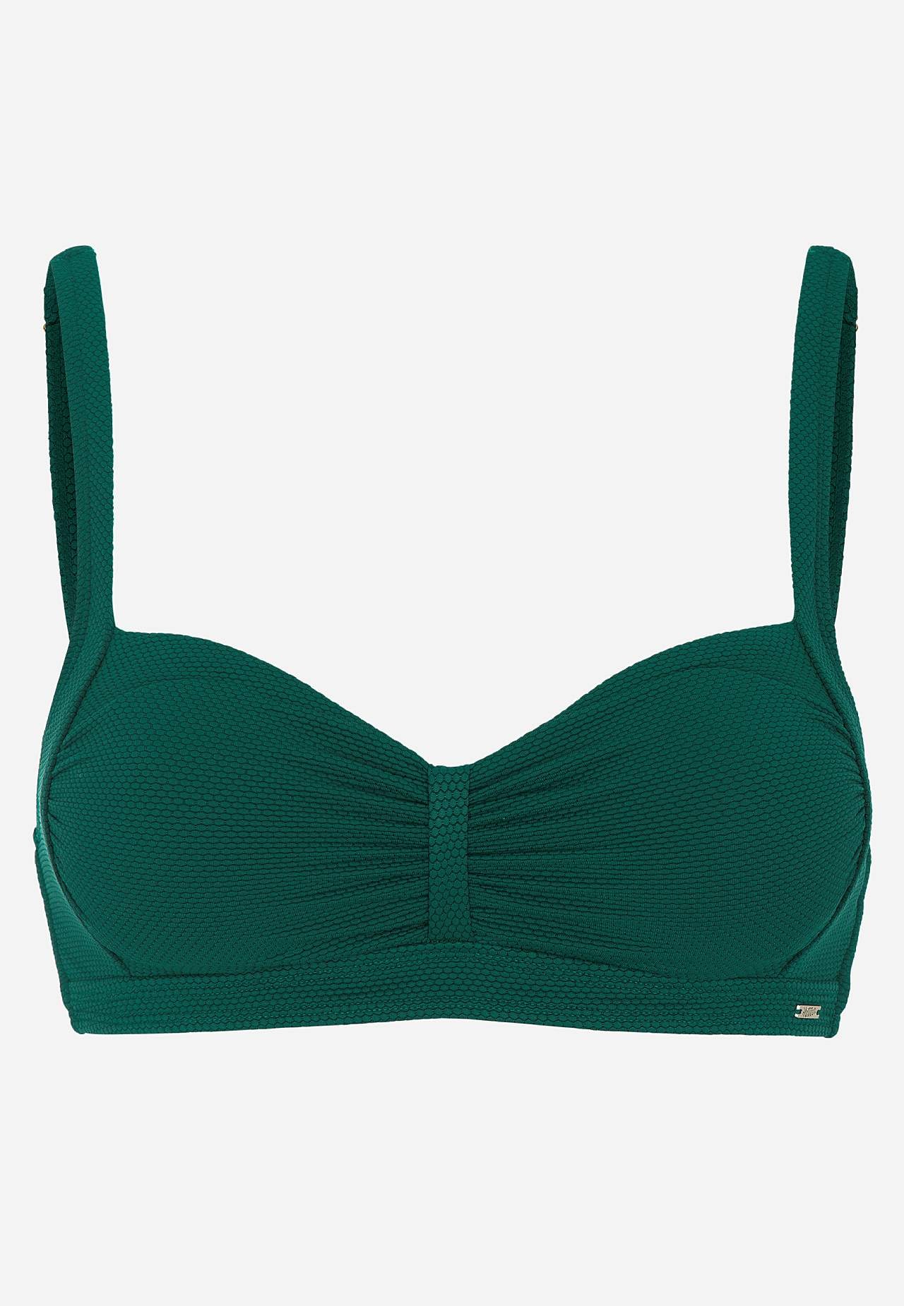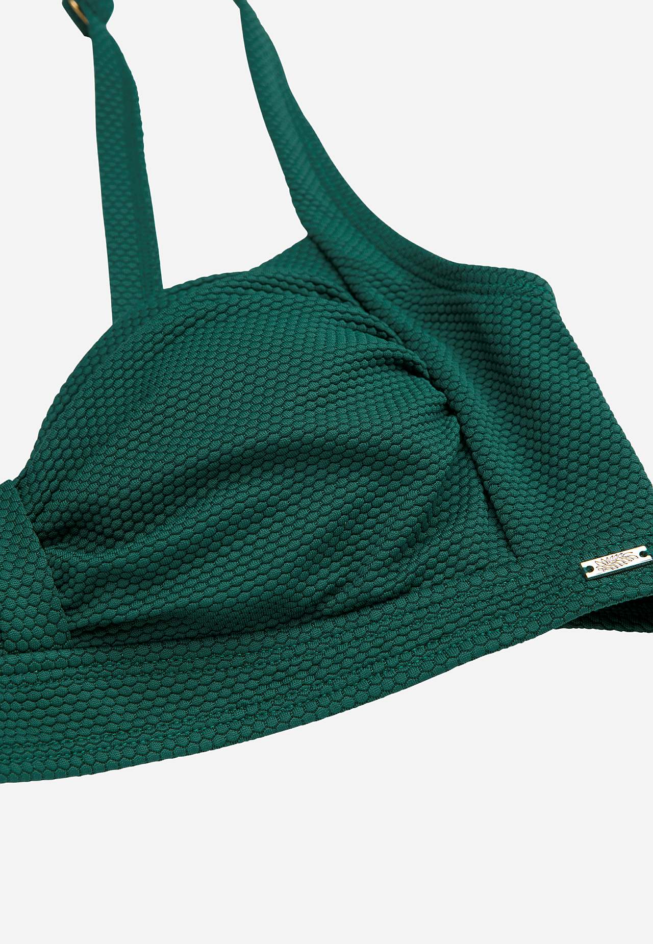 Struktuursel bikiinitopil on rinnakohal voldid. Pehmel tugikaarteta bikiinirinnahoidjal on külgedel plastiktugevdused. Taaskasutatud polüestrist bikiinirinnahoidja. Eemaldatava polsterdusega korvid. Reguleeritavad õlapaelad. Lihtsalt suletav metallkinnis taga.